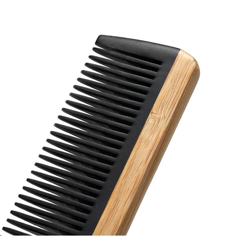 The contoured handle gives the comb a modern look while ensuring lightness and comfort of use . Bamboo is an excellent material - ecological and durable , more resistant to moisture than wood. The long, narrow profile ensures a firm grip and precise maneuvering during styling , allowing you to achieve professional results. The comb is equipped with fine teeth in shades of black that are gentle on the hair, minimizing the risk of damage and making it smooth and shiny. Additionally, the tapered tip of the handle makes it easier to precisely separate hair strands when creating complex hairstyles, including even partings or separating strands.