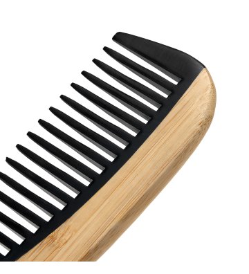 The contoured handle gives the comb a modern look while ensuring lightness and comfort of use . Bamboo is an excellent material - ecological and durable , more resistant to moisture than wood. The wide profile guarantees a firm grip and precise maneuvering during styling , which allows you to achieve professional results. The comb is equipped with evenly spaced teeth in shades of black that are gentle on the hair, minimizing the risk of damage and making it smooth and shiny .