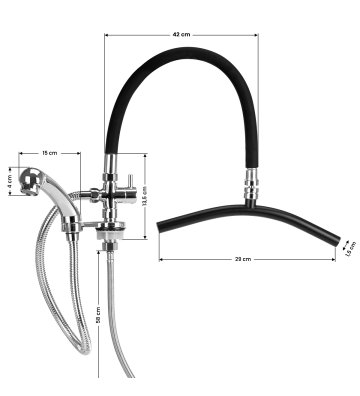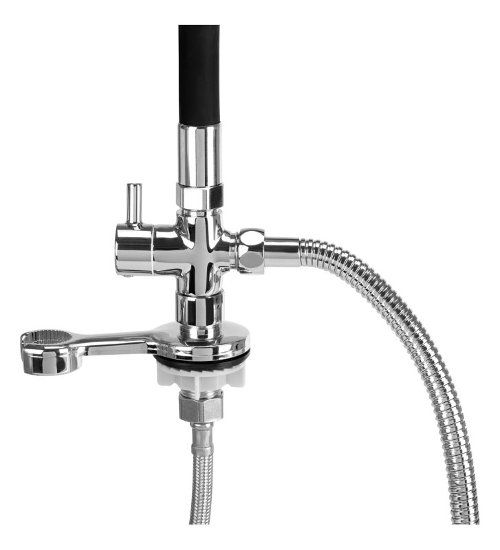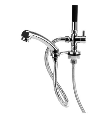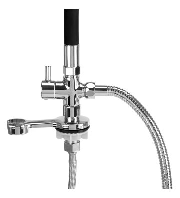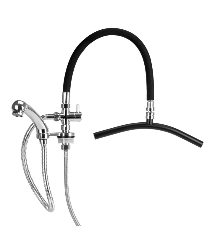 Bateria deszczownica Gabbiano dostępna jest w eleganckim wykończeniu w kolorach czerni i chromu, co pozwala na dopasowanie do nowoczesnych i stylowych wnętrz salonów fryzjerskich. Standardowa bateria jest przeznaczona do montażu przy misie umywalki fryzjerskiej, a przy tym dostosowana do większości modeli dostępnych na rynku.