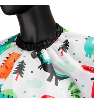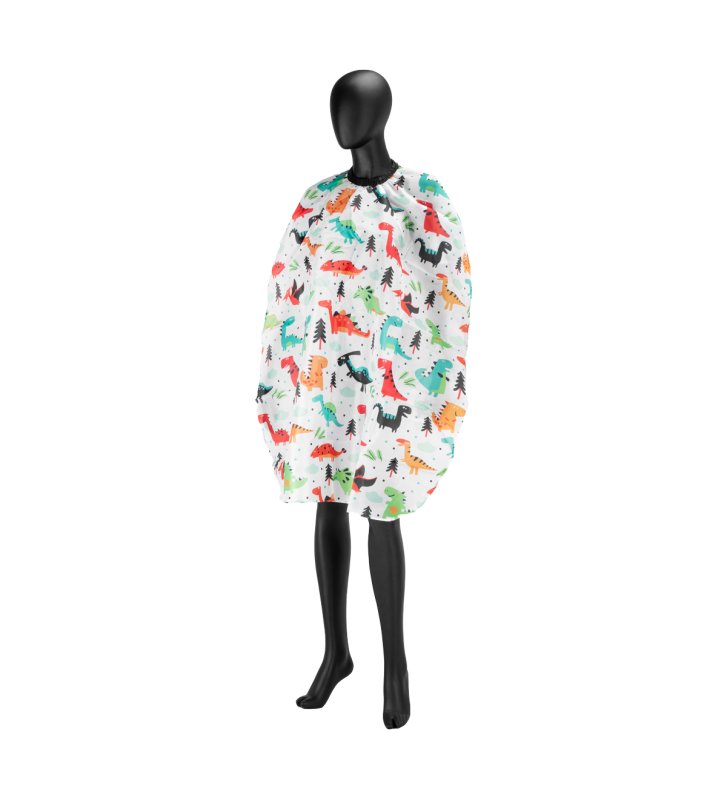Komfortowe zapięcie pozwala na regulowanie i indywidualne dostosowanie do każdego małego klienta. Produkt wykonany jest z wodoodpornego materiału, który pozwala na bezproblemowe czyszczenie. Nie przepuszcza również wilgoci, dzięki czemu w trakcie zabiegów chroni ubrania przed zamoczeniem. Wymiary oraz niezwykle proste składanie ułatwiają przechowywanie. Na pelerynie nadrukowane zostały kolorowe dinozaury, tak aby była jak najbardziej atrakcyjna dla najmłodszych. Dzięki temu może być traktowana jako ciekawe urozmaicenie wizyty u fryzjera.