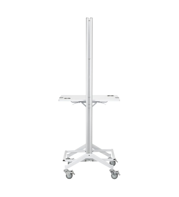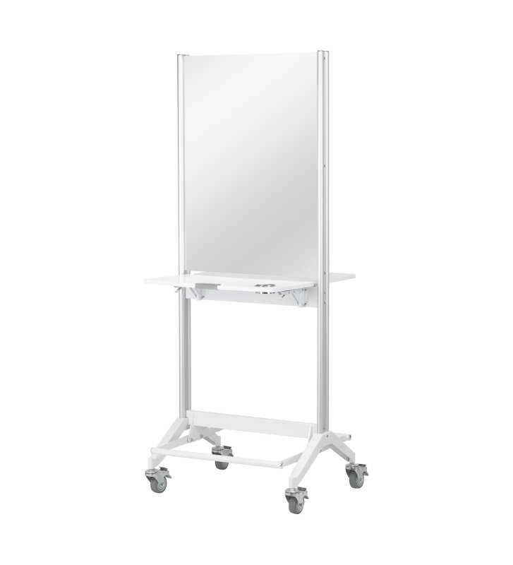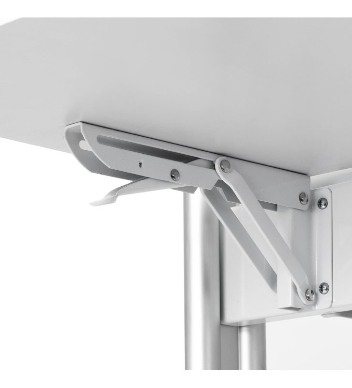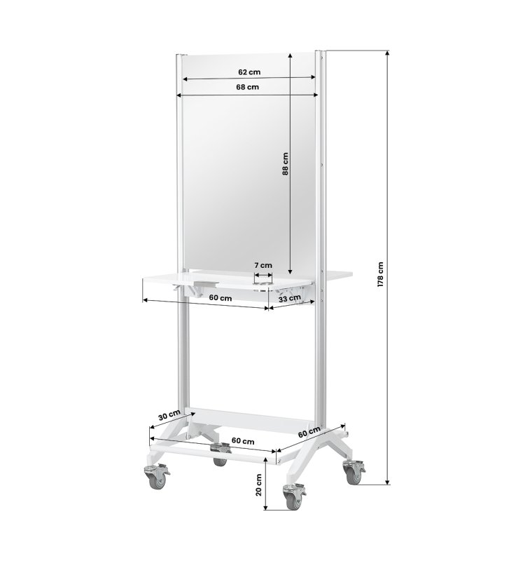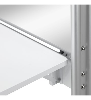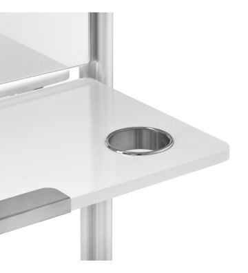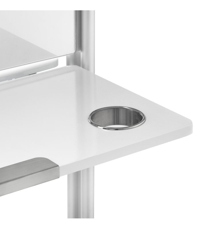 Praktyczna składana półka na wysokości 90 cm to jedna z głównych zalet konsoli MI-03, która pozwala zaoszczędzić miejsce, a jednocześnie oferuje funkcjonalną przestrzeń do przechowywania. Dodatkowo, dwustronna konstrukcja oraz kółka z możliwością blokowania zapewniają mobilność i łatwość w przestawianiu konsoli. Otwory w półce służą jako uchwyt na suszarkę, co czyni ją jeszcze bardziej praktyczną i dostosowaną do potrzeb profesjonalistów w branży fryzjerskiej.