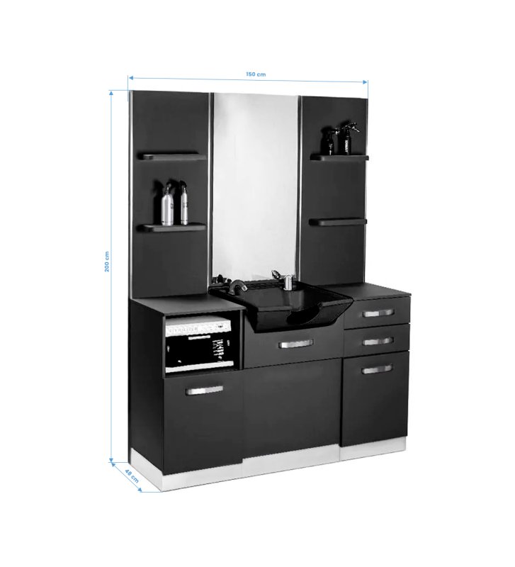 Nowoczesna konsola fryzjerska w kolorze czarnym ze srebrnymi wykończeniami. Duże lustro, czarna umywalka i szuflady zapewniają funkcjonalność, a cały mebel charakteryzuje się wykończeniem najwyższej klasy. Jest to elegancki i jednocześnie uniwersalny element wnętrza, który podkreśli charakter każdego salonu.