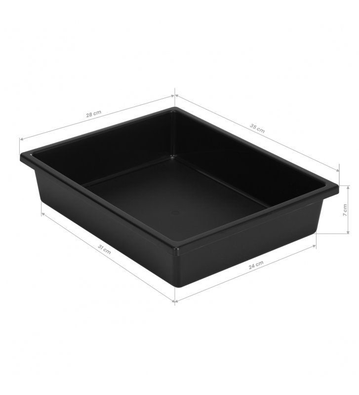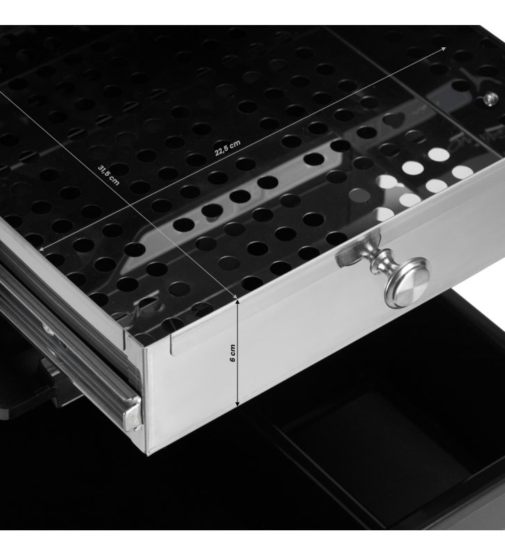 Pojemny organizer wyposażony jest w zestaw kuwet, które pomogą zadbać o porządek w miejscu pracy, posegregować odpowiednio niezbędne w pracy fryzjera przybory. W zestawie znajduje się sześć pojemników: dwa bez przegródek, dwa z przegródkami oraz dwa wąskie i głębsze. Ich układ w organizerze można dowolnie zmieniać, dopasowując go do własnych potrzeb, a znaczny wybór różnych typów szuflad pozwala na posegregowanie przyborów według uznania. Dodatkowo dwie najgłębsze kuwety można umieszczać na różnych wysokościach po bokach pomocnika, dzięki czemu ułożone w nich przybory zawsze znajdą się na odpowiednim poziomie. Zabudowany tył zabezpiecza szuflady przed przypadkowym ich wysunięciem w drugą stronę, co mogłoby skutkować uszkodzeniem znajdujących się w nich przyborów.