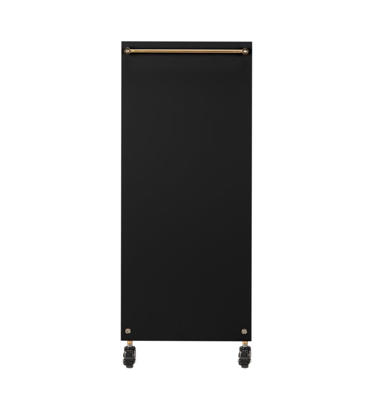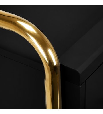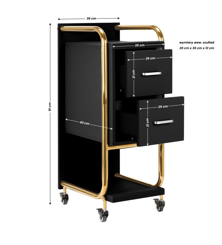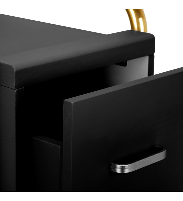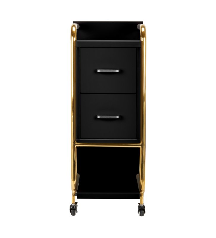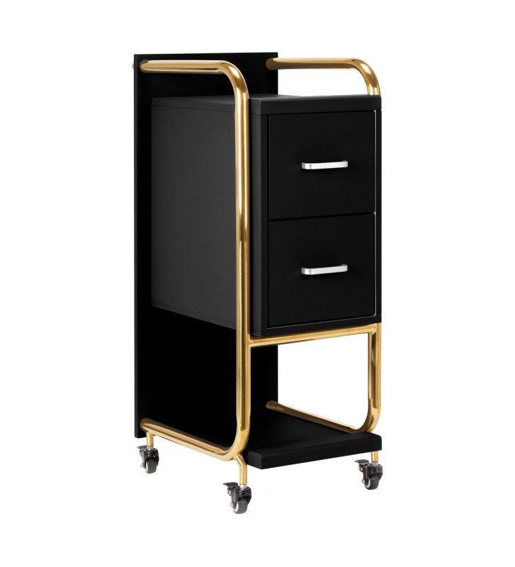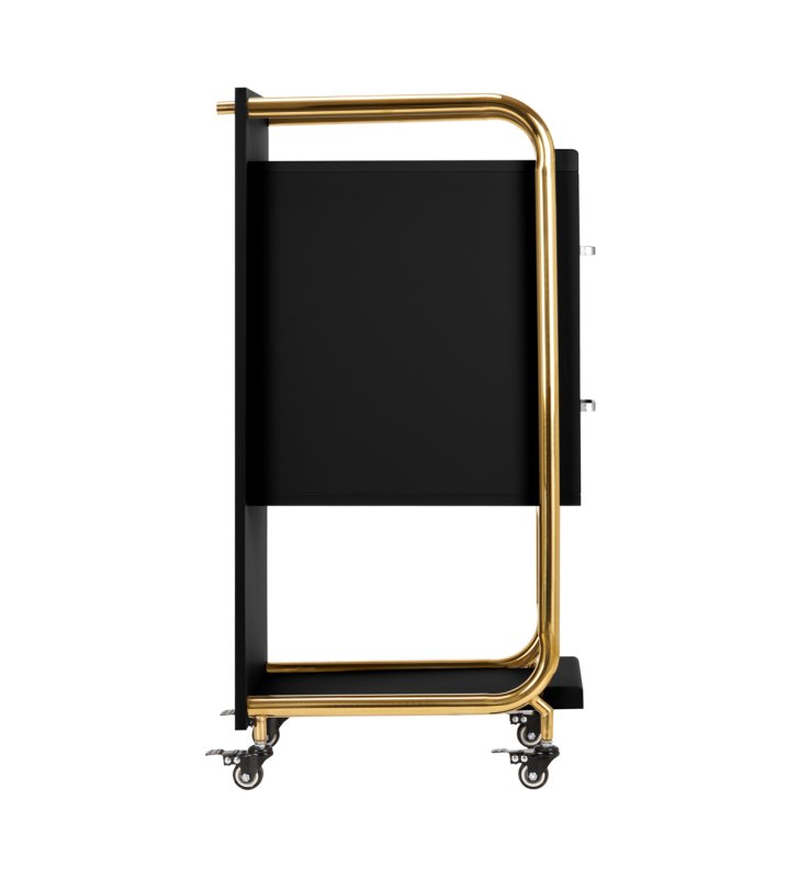 Wysokiej jakości pomocnik fryzjerski Gabbiano Solo to elegancki element wyposażenia, który znacząco usprawnia pracę w salonie fryzjerskim. Dwie pojemne szuflady oraz dwie różnej wielkości półki znacząco ułatwiają organizację produktów i niezbędnych narzędzi. Gumowane kółka z hamulcami zapewniają odpowiednią mobilność, co pozwala na swobodne ustawianie mebla w dowolnym miejscu salonu. Elegancki design – polerowane metalowe elementy w odcieniach złota oraz stabilna konstrukcja z drewnianych płyt w odcieniach czerni – doskonale podkreśli charakter wnętrz.
