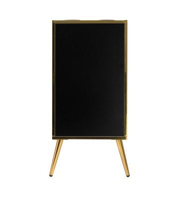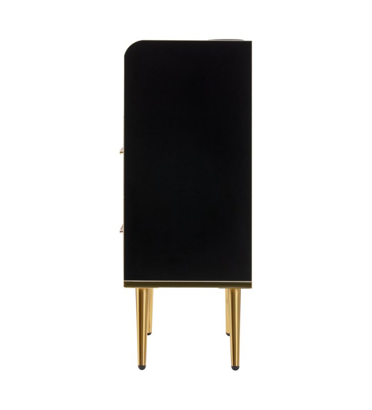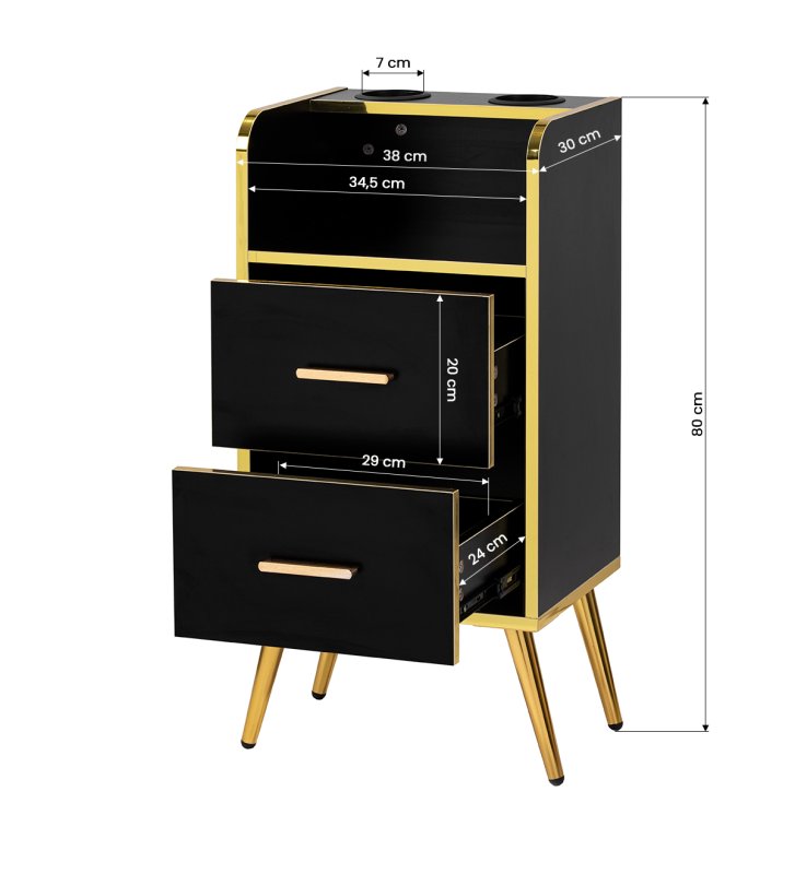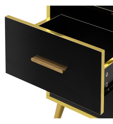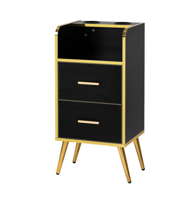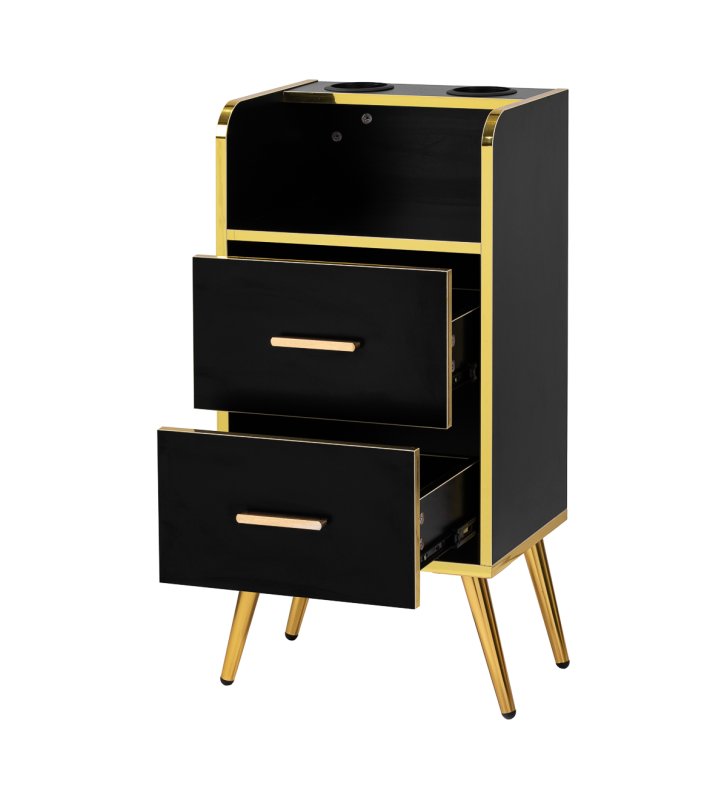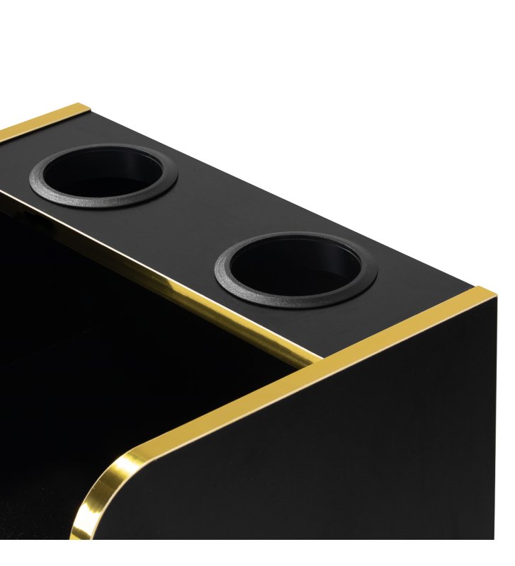 Nowoczesna, czarna konstrukcja z matowym wykończeniem sprawia, że pomocnik przyciąga wzrok i idealnie pasuje do eleganckich, profesjonalnych wnętrz. Polerowane metalowe elementy w odcieniach złota oraz solidna konstrukcja z drewnianych płyt w odcieniach czerni podkreślają elegancję wnętrza. Złote nóżki nie tylko dodają klasy, ale także ułatwiają utrzymanie czystości pod meblem, co jest istotne w każdym profesjonalnym salonie.