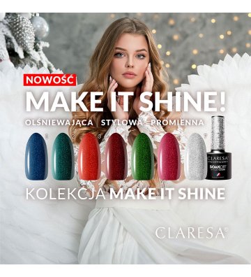 Świąteczne stylizacje paznokci mają zazwyczaj jeden mianownik - iskrzące drobiny. Chcąc wyczarować błyszczące zdobienia, możesz sięgnąć po brokatowe pyłki, żele lub naklejki. Dla tych, którzy cenią sobie prostotę wykonania lub jednolity wzór, stworzona została kolekcja 7 kolorów lakierów hybrydowych Claresa Make It Shine! Granaty, brązy, pomarańcze, zielenie, czerwienie oraz srebro to kolory, które jednoznacznie kojarzą się z okresem zimowo-świątecznym, dlatego stawiając na klasykę, Claresa stworzyła kolekcję opartą o skojarzenia związane z tym magicznym okresem. Kolekcja Make It Shine! to 7 lakierów hybrydowych z mieniącymi się drobinkami, które doskonale sprawdzą się zarówno przy wigilijnym stole, jak i na noworocznej imprezie