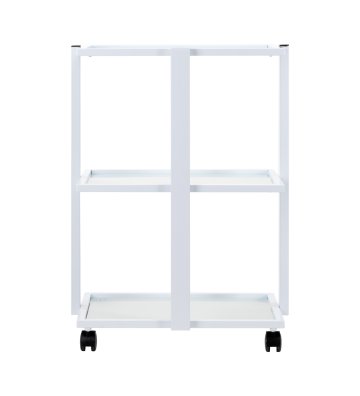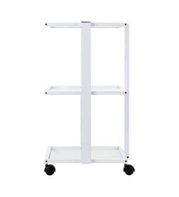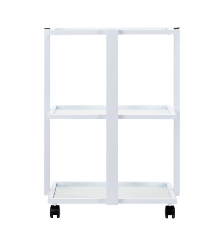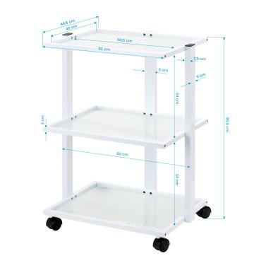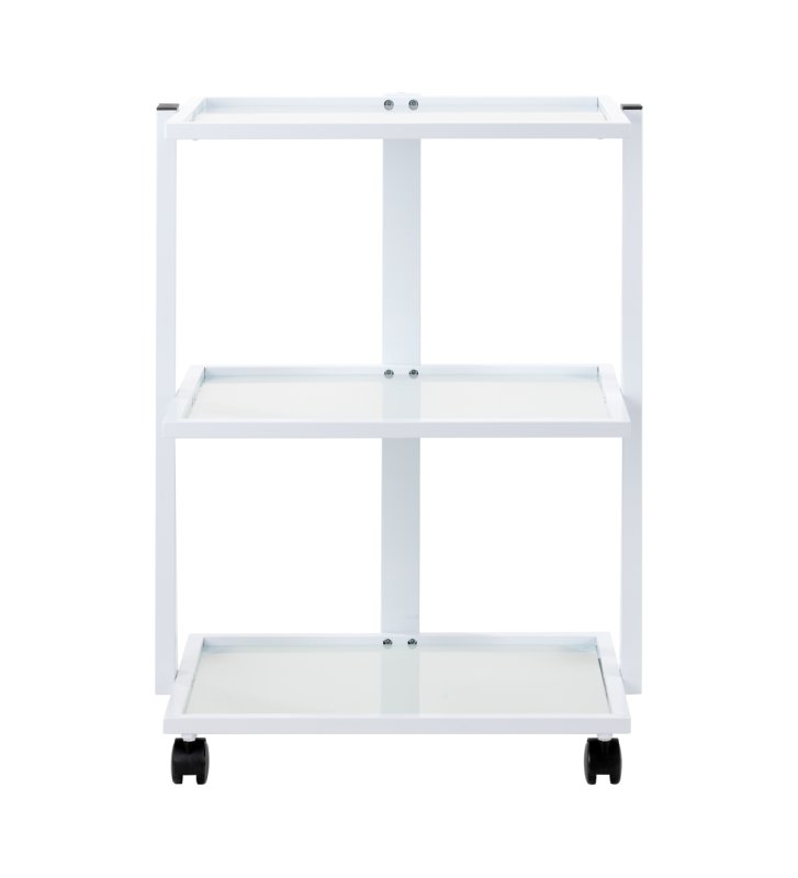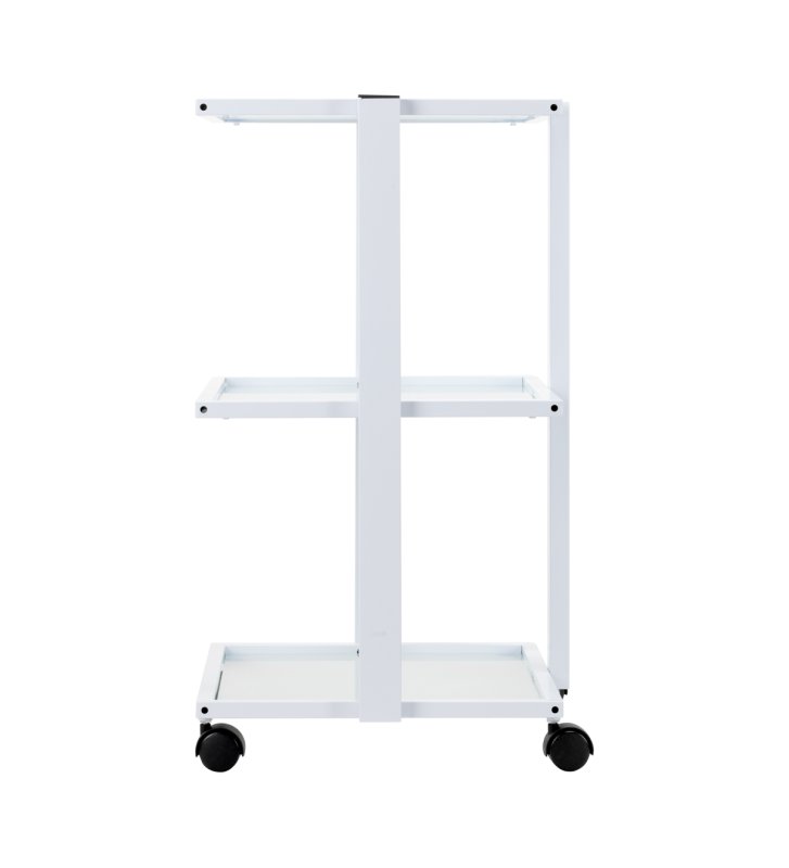 Prosta konstrukcja, stelaż z trwałego aluminium w odcieniach bieli oraz szklane półki łączą elegancję z praktycznością, zapewniając wytrzymałość i stabilność mebla. Gładkie powierzchnie ułatwiają utrzymanie stolika w czystości, a cztery kółka umożliwiają jego swobodne przestawianie, co zwiększa komfort pracy w salonie. Eleganckie wykończenie podkreśla profesjonalny charakter wnętrza. Na ramie stolika znajduje się specjalne miejsce, umożliwiające prosty montaż profesjonalnej lampy-lupy.