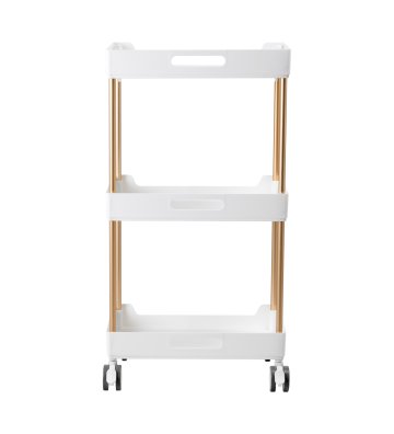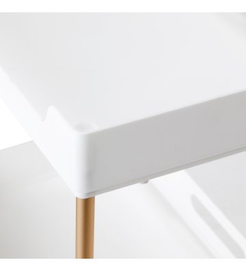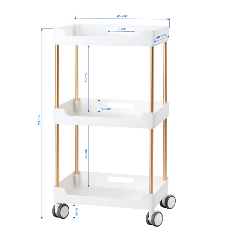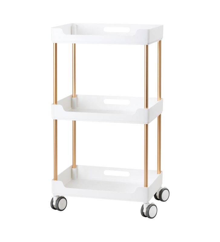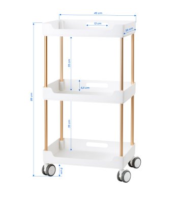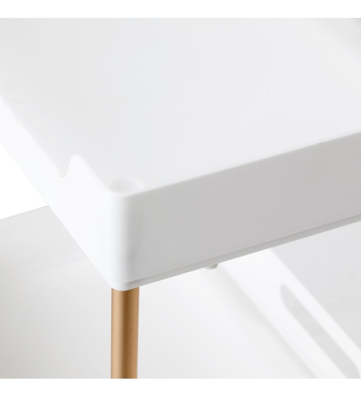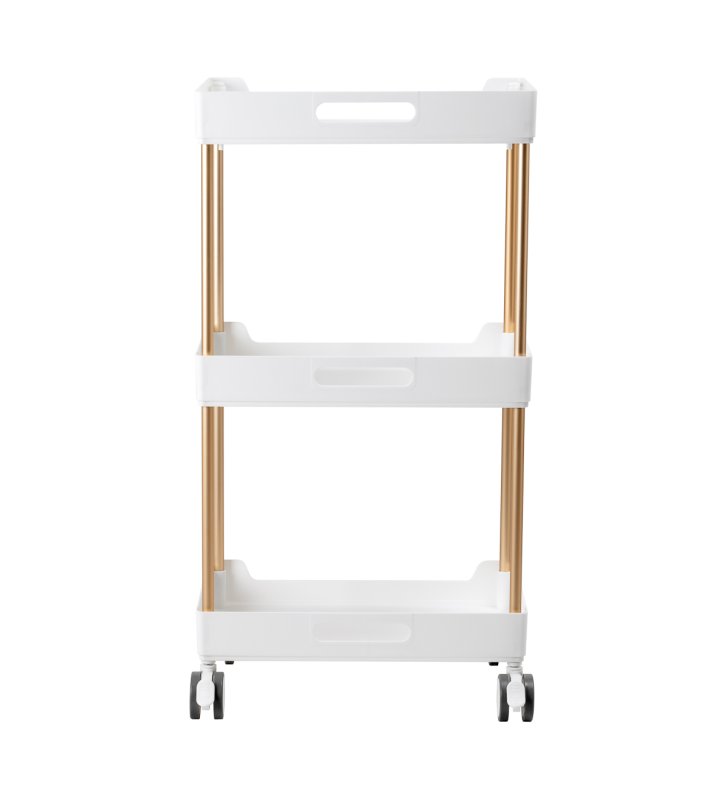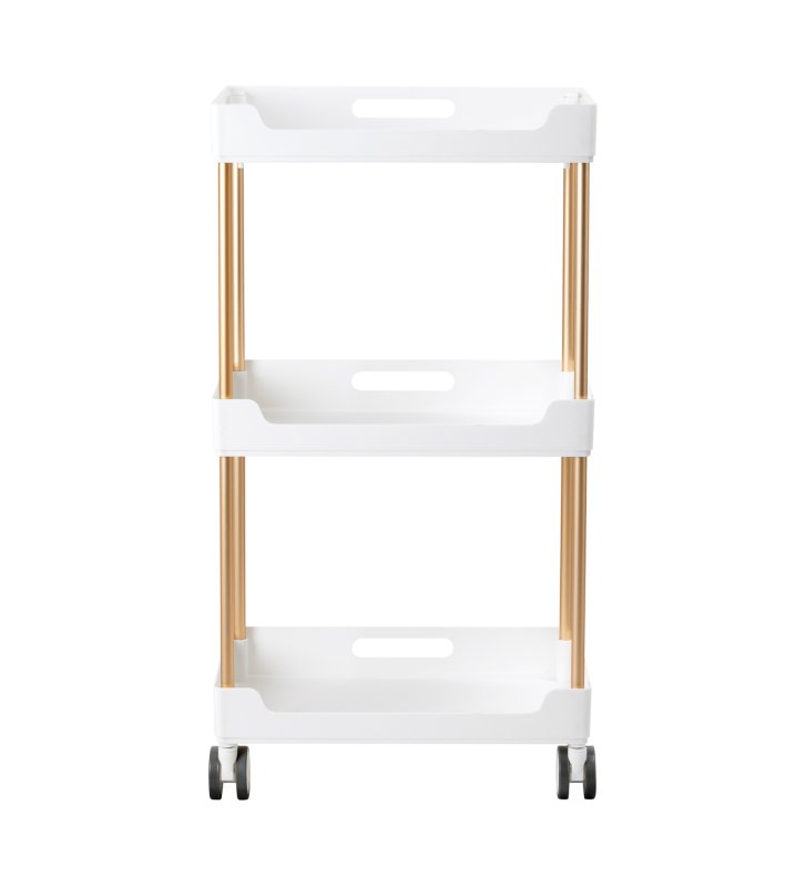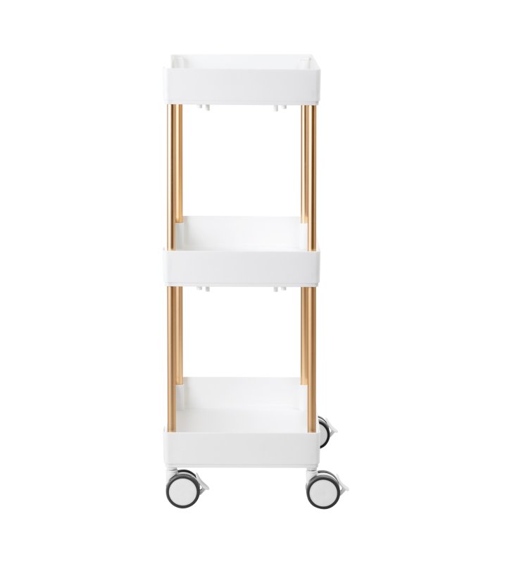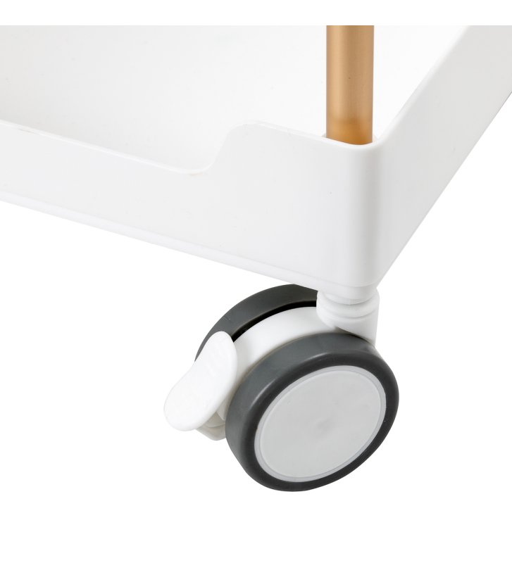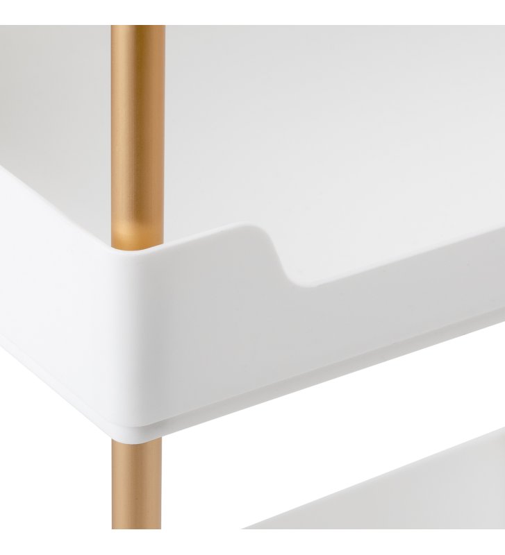 Półki wykonane z tworzywa sztucznego w odcieniach bieli w połączeniu z metalowymi rurkami w kolorze miedzi tworzą nowoczesną, estetyczną całość, którą łatwo utrzymać w czystości. Uchwyty na każdej z półek ułatwiają przesuwanie i zapewniają pewny chwyt. Pomocnik wyposażono w cztery kółka z blokadą, co gwarantuje mobilność i wygodę organizacji przestrzeni. Solidne materiały wpływają na trwałość mebla i wygodę jego użytkowania.