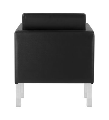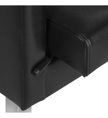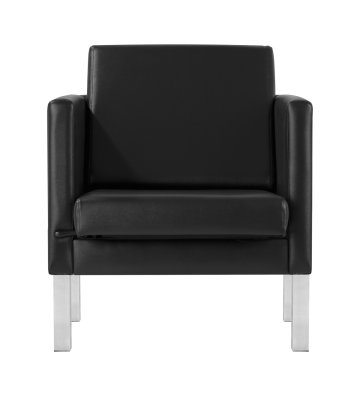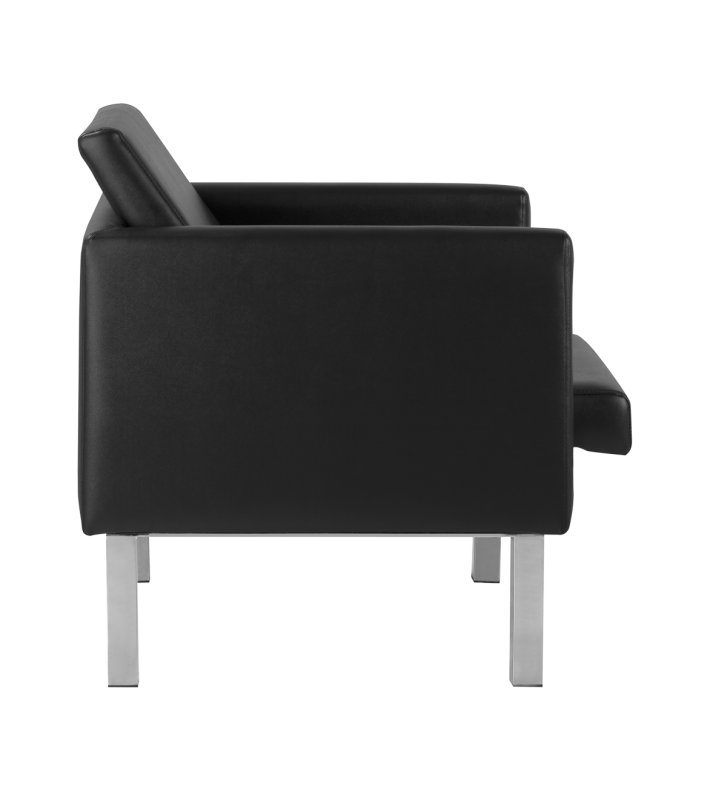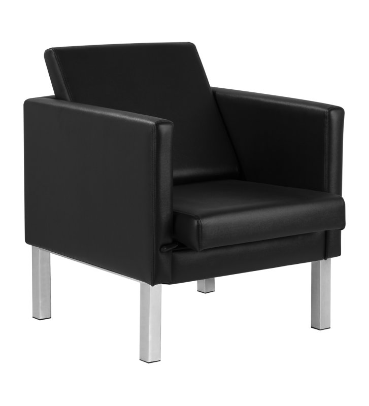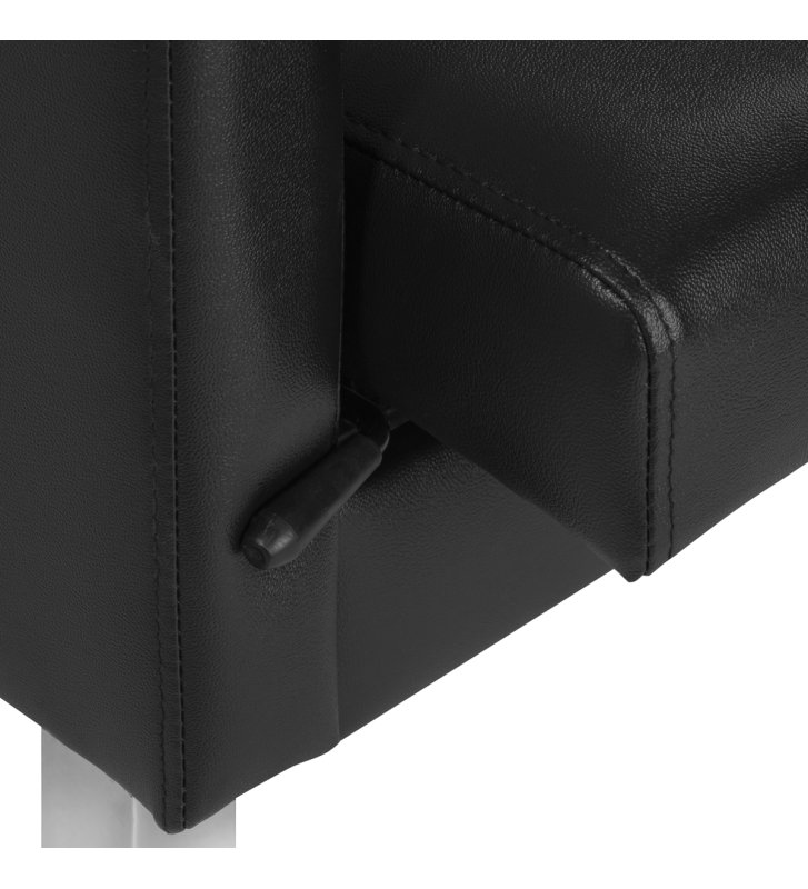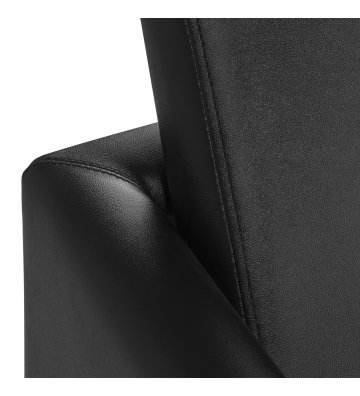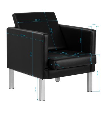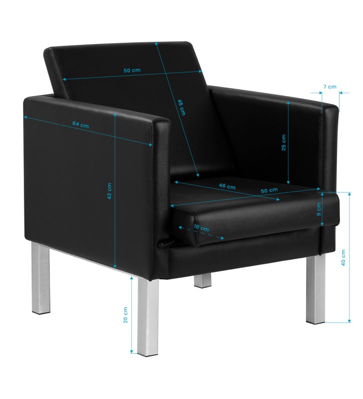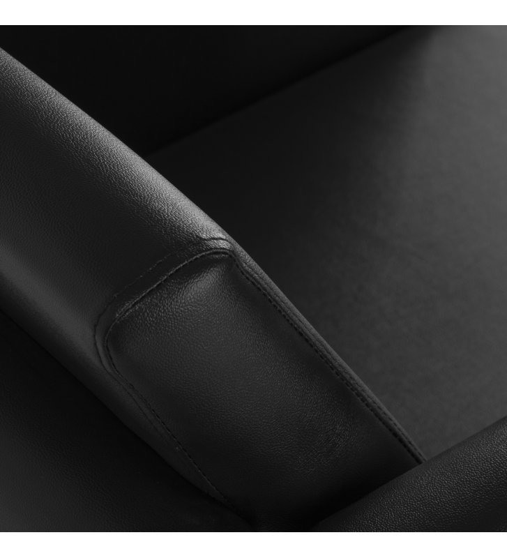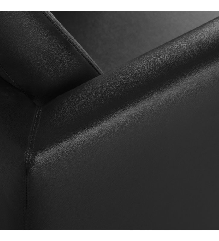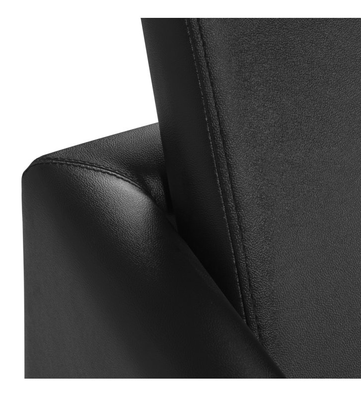 Fotel wykonany jest z trwałej, syntetycznej skóry w klasycznym, czarnym kolorze. Syntetyczna skóra jest łatwa do utrzymania w czystości, co pozwala na zachowanie idealnego wyglądu mebla przez długi czas. Dzięki wysokim nóżkom ułatwia utrzymanie porządku w salonie, umożliwiając łatwe sprzątanie przestrzeni pod nim.