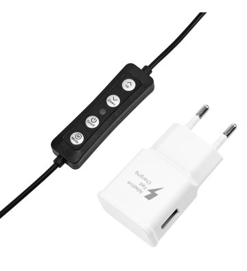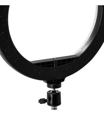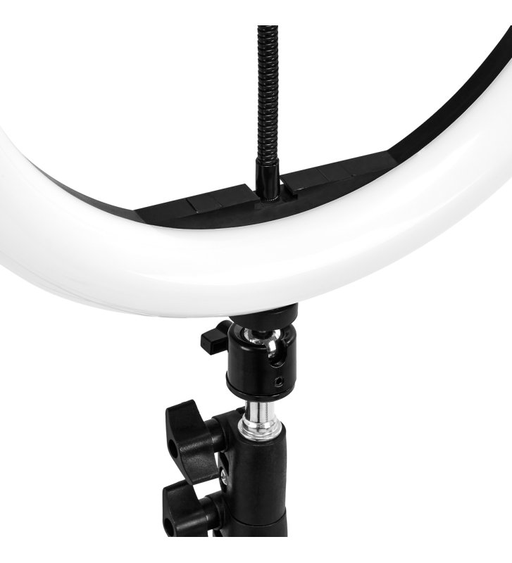The remote control on the cable allows you to step-by-step adjust the color temperature in a wide range of cold-intermediate-warm (from 3000 to 6000 K) and control the light intensity in 10 levels. This functionality provides additional flexibility when using the lamp. Mounting on a solid tripod guarantees comfortable work in a beauty salon, tattoo studio or at home. Additionally, inside the lamp ring there is a threaded adapter enabling the installation of a flexible phone holder , which is included in the set and - allowing the clamp to be extended to a maximum of 15 cm - fits most smartphones available on the market.