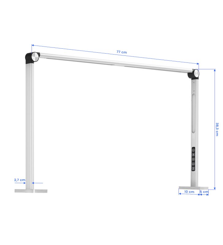Dotykowy panel umożliwia pełną kontrolę nad ustawieniami oświetlenia – regulacji zarówno jego barwy (w 5 poziomach: od ciepłej 2800 K do chłodnej 5400 K), jak i natężenia światła (w 5 poziomach). Takie rozwiązanie pozwala idealnie dopasować oświetlenie do specyfiki wykonywanego zabiegu, zapewniając wygodę pracy i zmniejszając zmęczenie oczu, nawet podczas długotrwałego użytkowania. Mleczne, półprzezroczyste powierzchnie paneli skutecznie rozpraszają światło, eliminując efekt oślepiania. Dodatkowo użytkownik może wybrać sposób świecenia – włączyć boczne panele, górny panel lub wszystkie jednocześnie – co umożliwia precyzyjne dostosowanie oświetlenia.