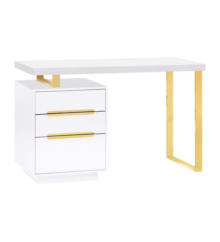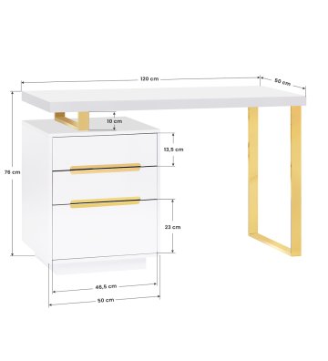 Biurko wyróżnia się estetycznym wyglądem, który nadaje wnętrzom ponadczasową elegancję. Wykorzystanie wysokiej jakości materiałów zapewnia trwałość mebla oraz łatwość w utrzymaniu czystości. Minimalistyczna forma sprawia, że biurko nie tylko ułatwia przechowywanie produktów i akcesoriów, ale także stanowi estetyczny element wyposażenia, który podkreśla elegancję przestrzeni salonów kosmetycznych. Złote akcenty dodatkowo dodają mu wyjątkowego charakteru. Dodatkowym atutem biurka jest jego wszechstronność – można je ustawić w linii prostej jako prawe lub lewe, a także zmieniać położenie szafki, umieszczając ją wewnątrz lub na zewnątrz. Dzięki temu łatwo dostosować rozmiar i układ biurka do swoich potrzeb.