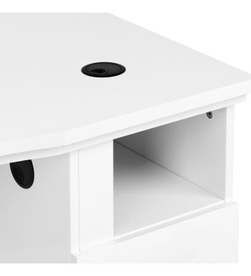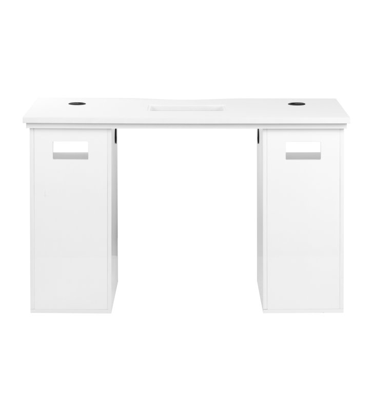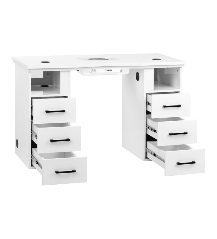 Szafki po obu stronach z trzema pojemnymi szufladami ułatwiają organizację i pomagają utrzymać porządek wśród najpotrzebniejszych kosmetyków i narzędzi. Dzięki temu wszystko, co niezbędne, zawsze znajduje się pod ręką, co sprzyja płynnej i efektywnej pracy. Otwarte półki tuż nad szufladami zapewniają dodatkowe miejsce – idealne na urządzenia lub często używane przedmioty. Biurko zostało wyposażone w specjalne otwory i przelotki na kable, co pozwala na estetyczne i uporządkowane poprowadzenie przewodów od urządzeń.