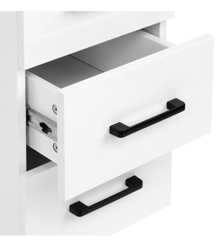 Prosta forma biurka w odcieniach bieli nadaje wnętrzu nowoczesny i elegancki charakter. Czarne uchwyty szuflad wprowadzają kontrast, który podkreśla stylowy wygląd mebla. Przemyślane detale, takie jak zintegrowane otwory na przewody i miejsce na montaż akcesoriów, sprzyjają utrzymaniu porządku na stanowisku pracy. Kompaktowa, a jednocześnie stabilna konstrukcja sprawia, że biurko sprawdzi się zarówno w małych gabinetach, jak i większych, nowoczesnych przestrzeniach. To funkcjonalne i estetyczne rozwiązanie dla osób ceniących wygodę, organizację i spójny design.