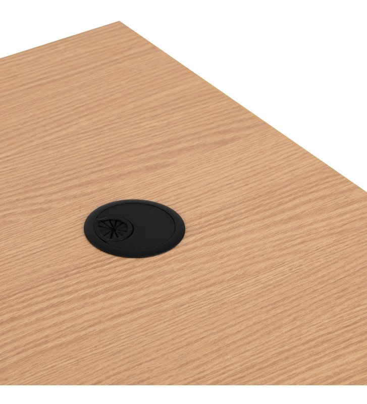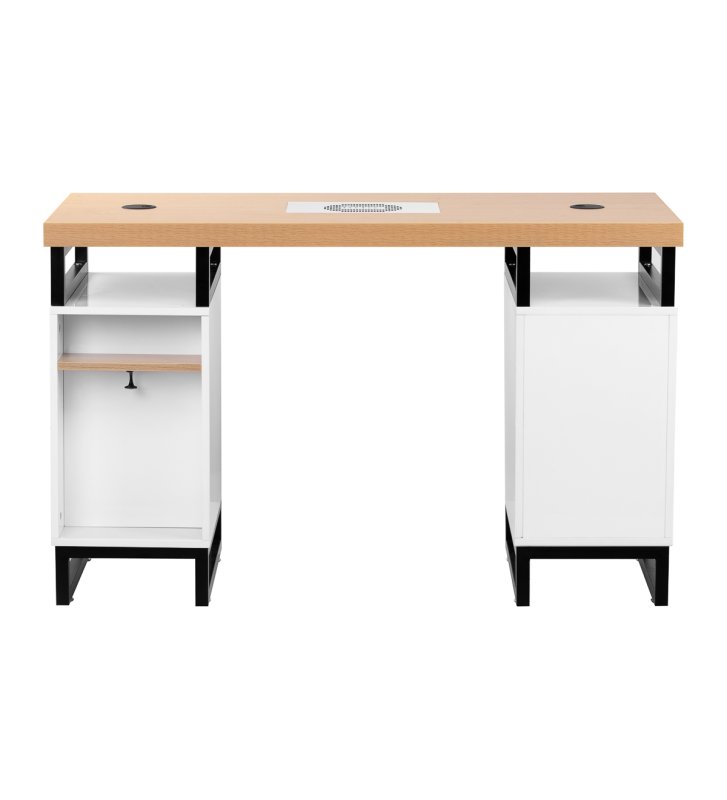 Biurko wyposażone jest w dwie funkcjonalne szafki z pojemnymi szufladami – po lewej stronie znajdują się cztery, a po prawej dwie i jedna większa, idealna na duże akcesoria czy urządzenia. Taki układ ułatwia utrzymanie porządku i szybki dostęp do niezbędnych narzędzi. Otwarte półki nad szufladami sprawdzą się doskonale jako miejsce na urządzenia lub najczęściej używane przybory. Specjalne przelotki i otwory na kable pozwalają estetycznie poprowadzić przewody, co podnosi komfort pracy i sprzyja zachowaniu porządku na stanowisku. Z tyłu biurka znajduje się praktyczny wieszaczek i niewielka półka do dyspozycji klientów.