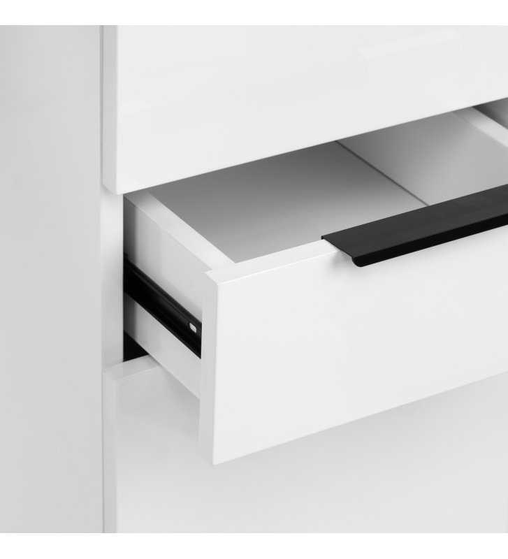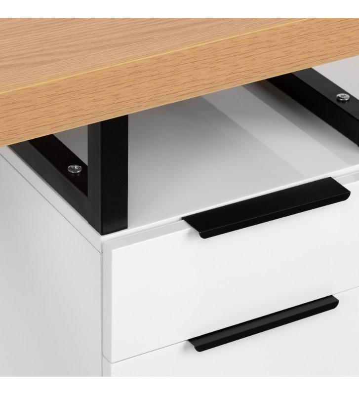 Połączenie blatu w odcieniach drewna z białymi frontami oraz czarnymi elementami ramy i uchwytami tworzy nowoczesny, a zarazem profesjonalny wygląd. Kontrast między białymi szafkami, drewnianym blatem i czarną, metalową ramą nadaje biurku elegancki, współczesny charakter. Stabilna metalowa podstawa zapewnia trwałość oraz komfort, nawet podczas wielogodzinnej pracy. To doskonały wybór zarówno do mniejszych salonów, jak i przestronnych gabinetów z nowoczesnym wystrojem.