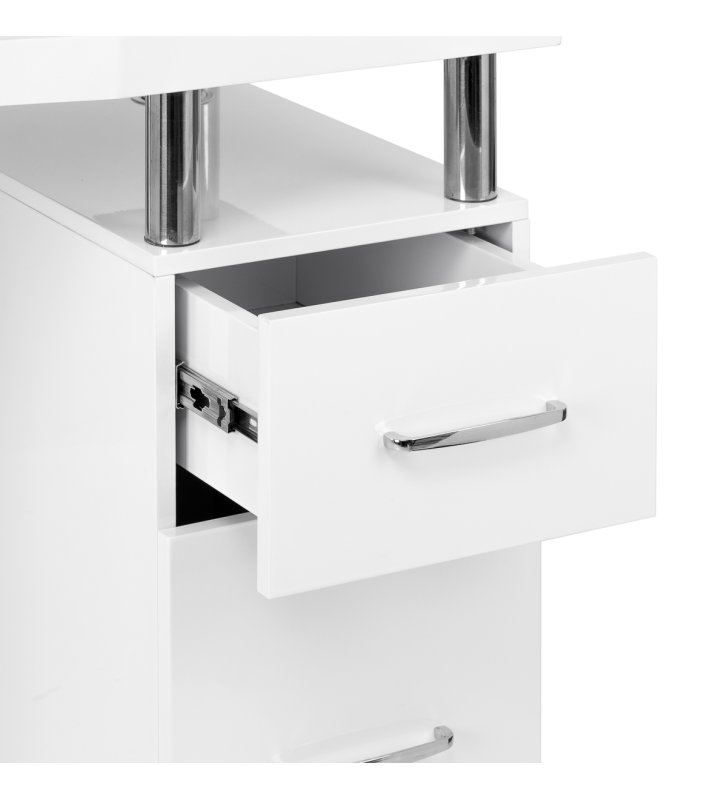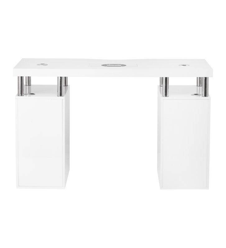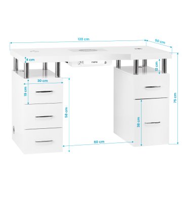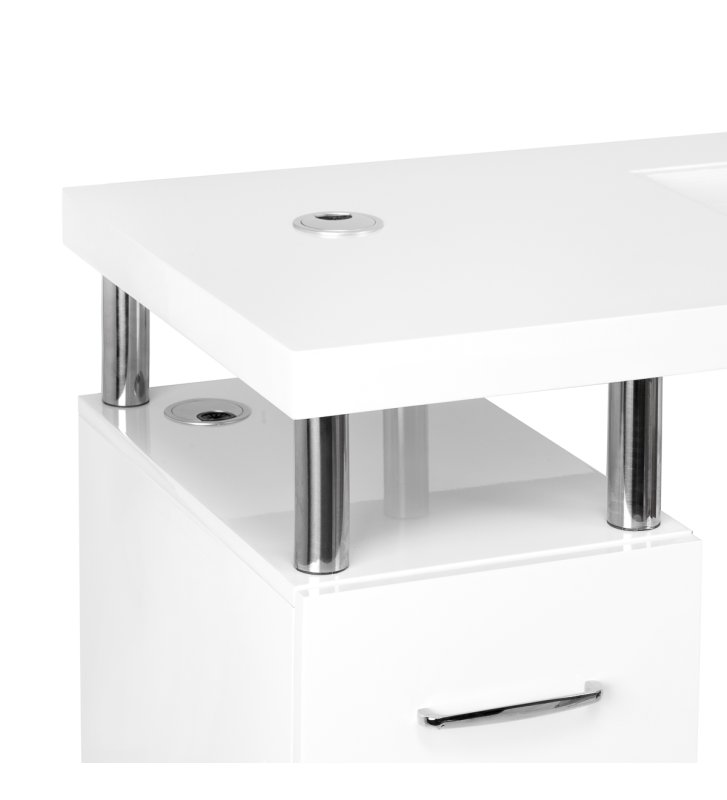 Biurko wyposażone jest w dwie funkcjonalne szafki z pojemnymi szufladami – po lewej stronie znajdują się trzy mniejsze, a po prawej jedna mniejsza i jedna większa, idealna na urządzenia. Przemyślany układ ułatwia organizację przestrzeni roboczej i zapewnia szybki dostęp do najpotrzebniejszych kosmetyków oraz narzędzi. Wszystko, co niezbędne, znajduje się w zasięgu ręki, co sprzyja płynnej i komfortowej pracy. Dodatkowe otwarte półki umieszczone nad szufladami stanowią idealne miejsce na urządzenia lub często używane przybory. Biurko wyposażono również w otwory i przelotki na kable, które pozwalają na estetyczne i uporządkowane poprowadzenie przewodów, eliminując niepotrzebny chaos na stanowisku.
