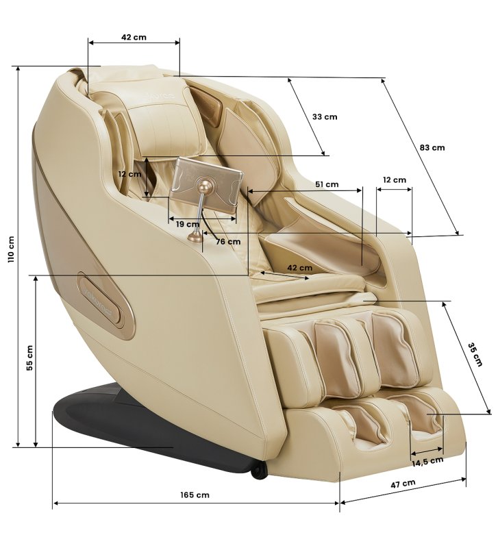 Szczegółowe wymiary fotela podano na zdjęciu. Zestaw zawiera: fotel, podnóżek, panel z wyświetlaczem LCD, instrukcję.