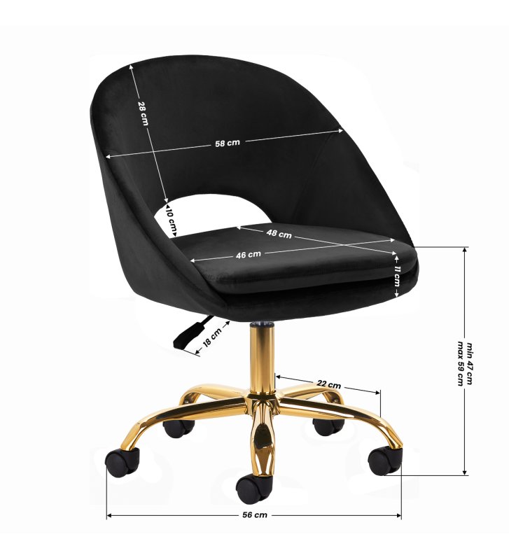 The efficient gas lift allows for easy adjustment of the seat height within 47-59 cm . This allows the chair to be tailored to individual needs and the services performed, ensuring high comfort of use - both when applying makeup, eyebrow styling, and during other activities. The chair is equipped with a full rotation mechanism , which improves work efficiency and comfort. The contoured backrest provides adequate back support, and the cushion mounted on the seat with Velcro increases the comfort of use. The hole between the backrest and the seat makes it easier to keep the living room clean .