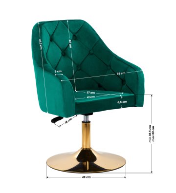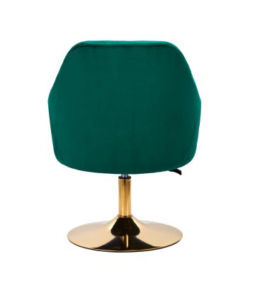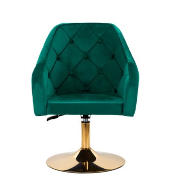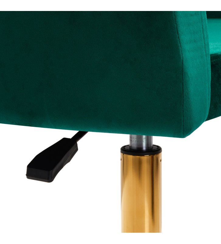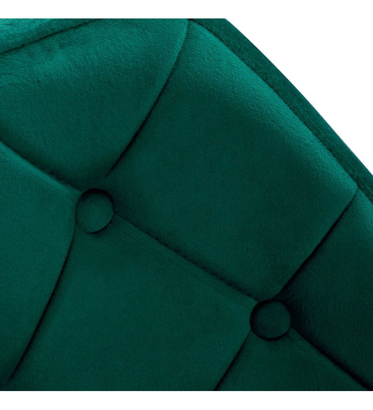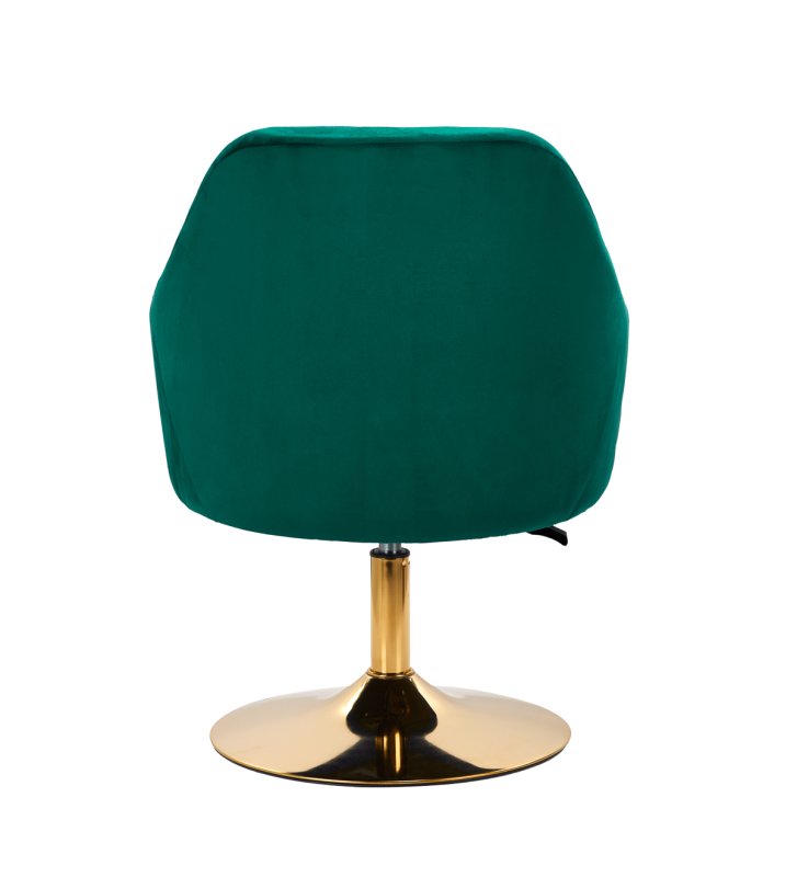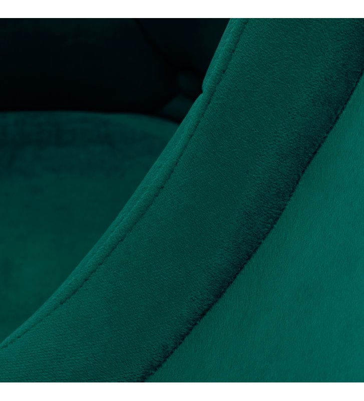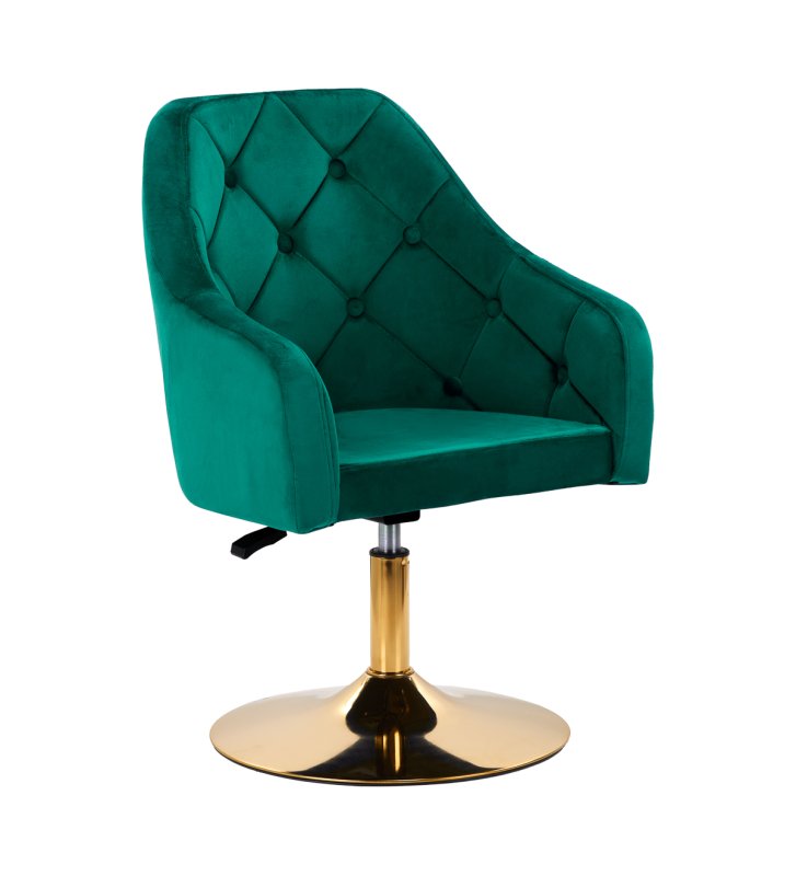 The interesting design gives the chair a unique character . Pleasant to the touch, velvet upholstery in shades of green and decorative quilting make it a decoration of any interior. A stable, round base in shades of gold adds elegance, perfectly matching the velvet. Aesthetics of workmanship , comfortably placed armrests, ergonomically profiled backrest and aesthetic quilting make the chair meet the requirements of even the most demanding users .