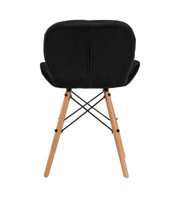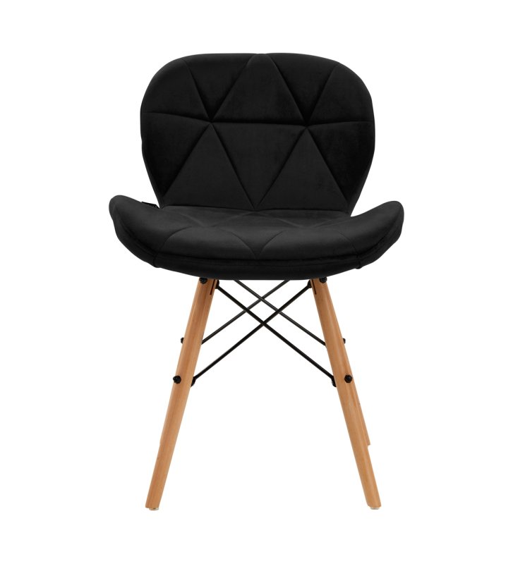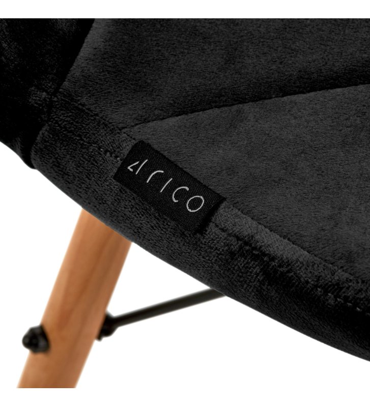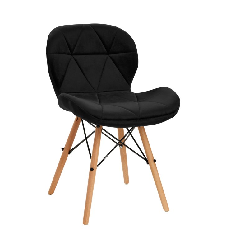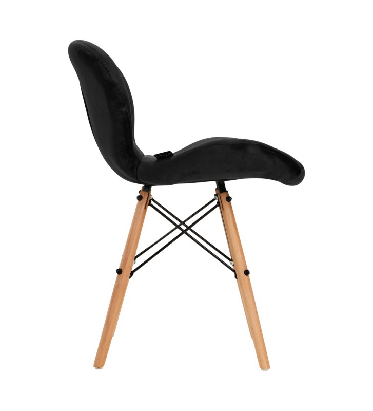 Siedzisko pokryte jest tapicerką z przyjemnego w dotyku welwetu w odcieniach czerni. Nadaje mu to ekskluzywny wygląd i zapewnia komfort użytkowania. Staranne przeszycia w geometrycznych kształtach stanowią elegancki sznyt, a łączący nogi metalowy stelaż w odcieniach czerni dodaje meblowi stabilności. Drewniane, matowo wykończone nóżki zakończono plastikowymi zabezpieczeniami, dodatkowo chroniącymi przed przypadkowym uszkodzeniem. Krzesło w stylu skandynawskim jest komfortowym meblem, który stanie się ozdobą recepcji każdego salonu kosmetycznego.