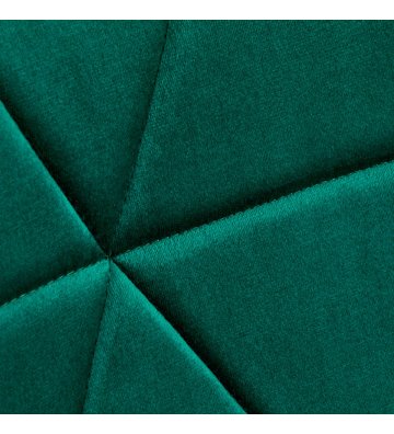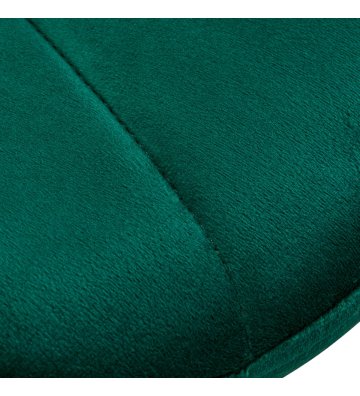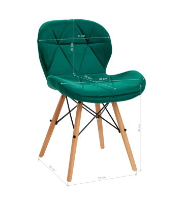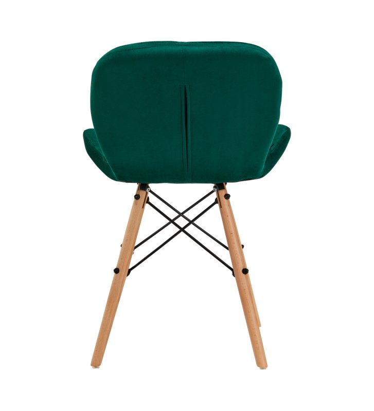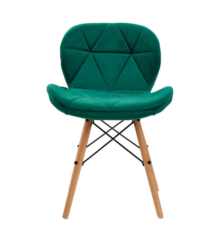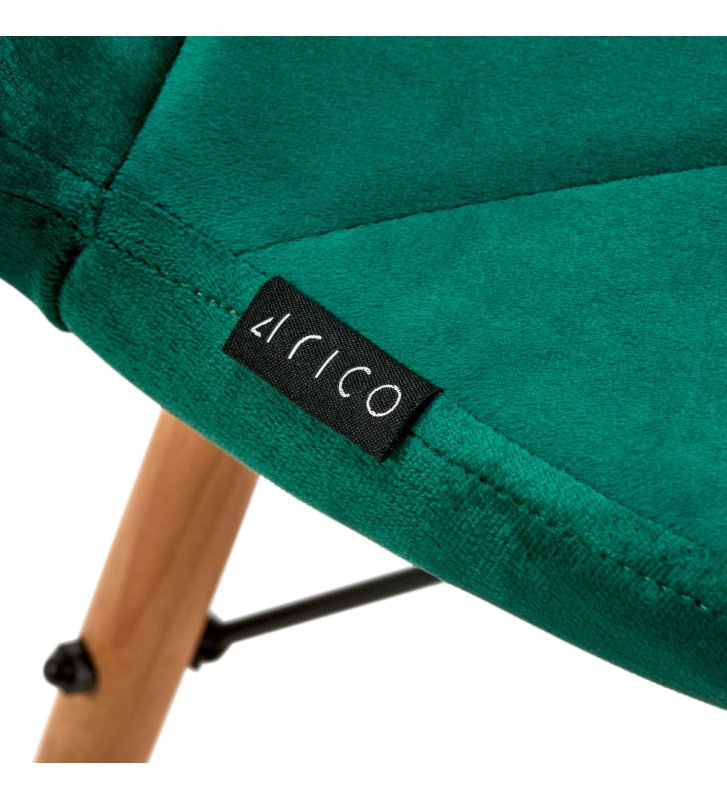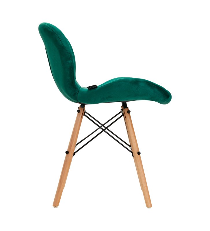 Siedzisko pokryte jest tapicerką z przyjemnego w dotyku welwetu w odcieniach zieleni. Nadaje mu to ekskluzywny wygląd i zapewnia komfort użytkowania. Staranne przeszycia w geometrycznych kształtach stanowią elegancki sznyt, a łączący nogi metalowy stelaż w odcieniach czerni dodaje meblowi stabilności. Drewniane, matowo wykończone nóżki zakończono plastikowymi zabezpieczeniami, dodatkowo chroniącymi przed przypadkowym uszkodzeniem. Krzesło w stylu skandynawskim jest komfortowym meblem, który stanie się ozdobą recepcji każdego salonu kosmetycznego.