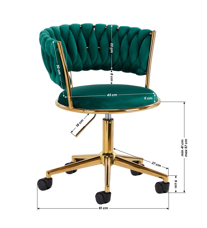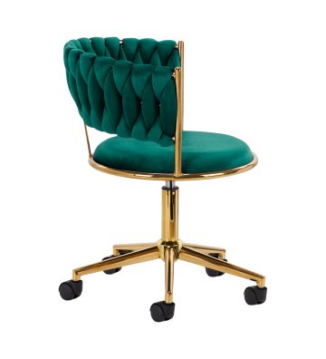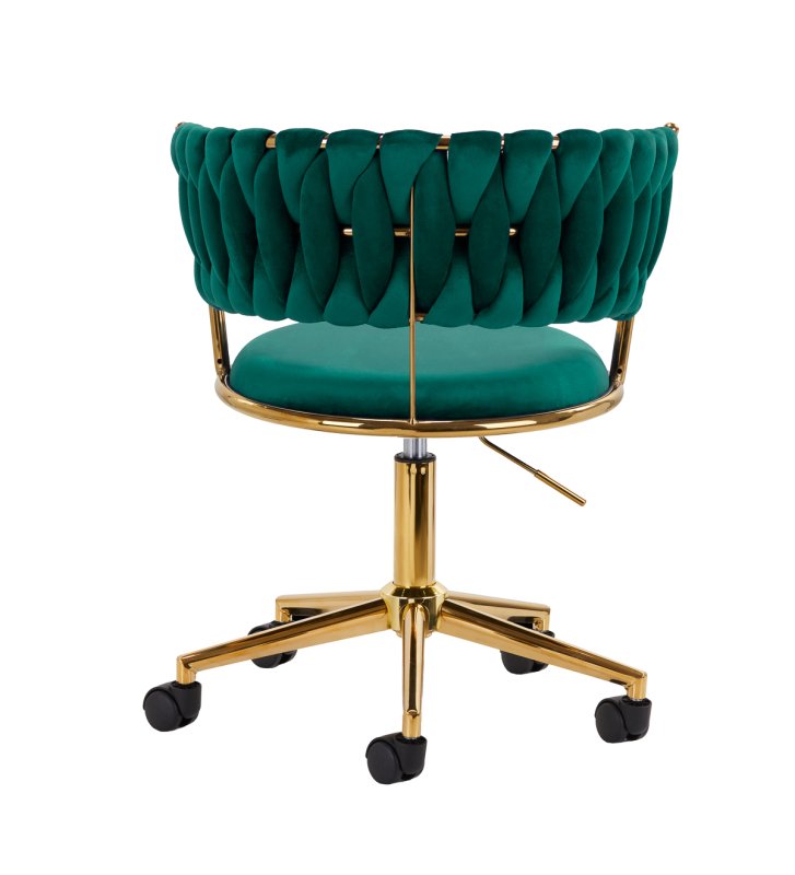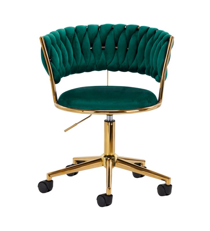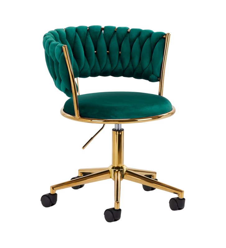 The finish makes the furniture eye-catching . Pleasant to the touch, velvet upholstery in shades of green gives it a unique character. The base in shades of gold adds elegance, perfectly matching the velvet. Functional wheels ensure mobility, making it easier to move the chair and move around the living room during work. Careful workmanship, comfort of use and aesthetically interwoven material on the profiled backrest make the chair meet the requirements of even the most demanding users .
