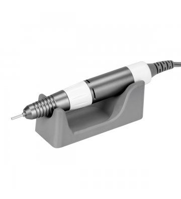 The red LED next to the switch indicates the device's operating status. The rotation speed of the milling head can be easily and smoothly adjusted using a special knob in the range from 0 to 35,000 rpm . The switch on the front of the device efficiently changes the direction of rotation , while the one on the back allows you to switch the control between hand and foot . The set includes a pedal whose function is to turn on the milling machine at a previously set speed. This ensures free, comfortable work thanks to the ability to control the device without using your hands. During work, the head can be safely placed on a dedicated silicone stand or hung up thanks to a convenient plastic handle that can be mounted on both sides of the device.