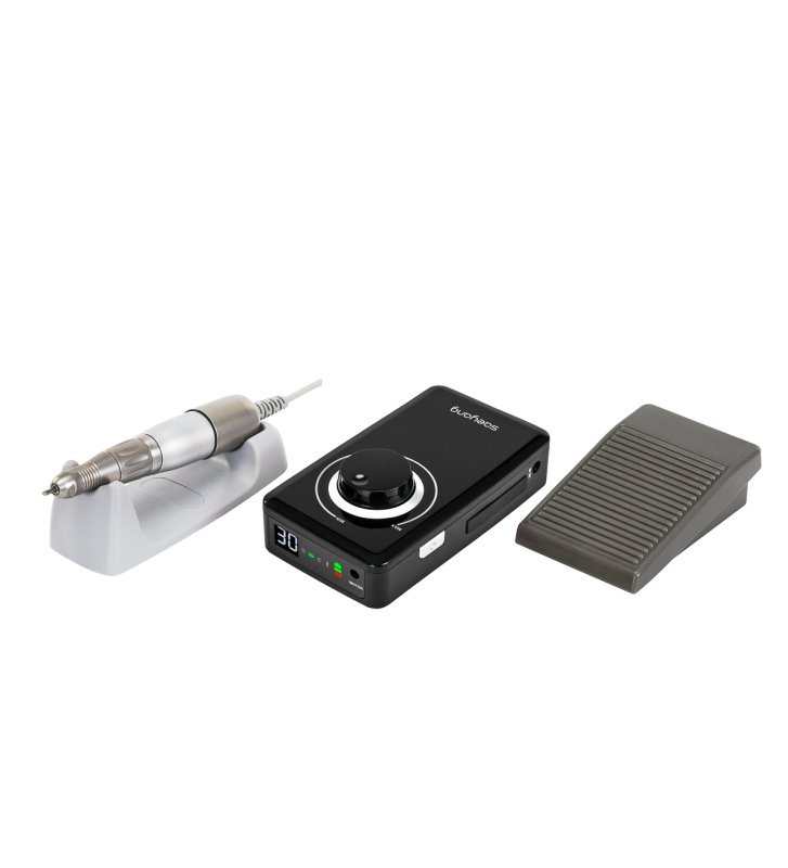 The milling machine is quite quiet , which allows you to work without irritating noise, which is important both for the person performing the treatment and for the clients. The built-in 2850 mAh battery allows comfortable operation for up to 4-8 hours on a single charge . Moreover, the device has an automatic energy saving mode , which prevents battery discharge even if the milling machine is left on when not in use. The foot drive allows you to work at a set speed, which increases the precision of work and the convenience of using the milling machine.