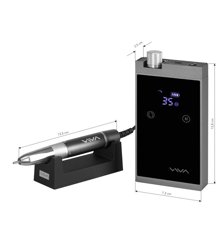 The compact VIVA PRO 601 cordless milling machine is a professional device that is perfect for mobile nail stylists, allowing for comfortable work anywhere. It allows for efficient preparation of nails for further treatments and significantly facilitates the removal of remnants of previous styling. It allows for comfortable work for up to 10 hours on a single charge.