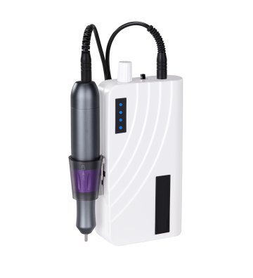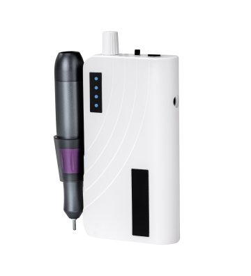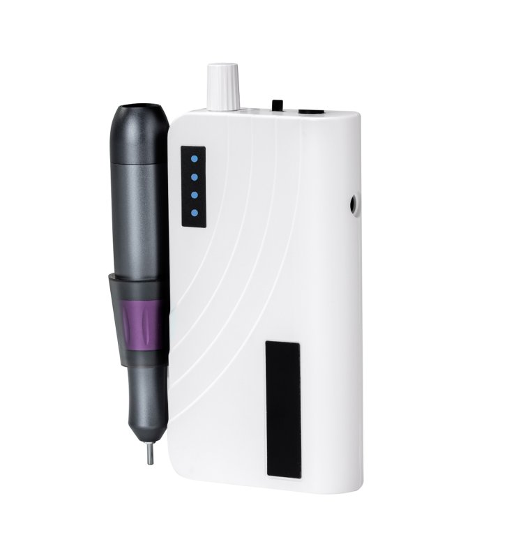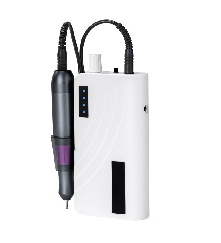 The efficient 2000 mAh bifocal battery , which the device is equipped with, allows for uninterrupted work for up to 8-10 hours on a single charge . The milling machine operates relatively quietly, which allows for comfortable work without irritating noise. This is important both for the person performing the procedure and for the comfort of the clients. During work, the head can be safely hung up thanks to the convenient plastic handle , which can be mounted on the side of the device. The set includes a set of diamond milling cutters, a carrier and abrasive bands , which ensures versatility of use and facilitates the performance of various treatments.