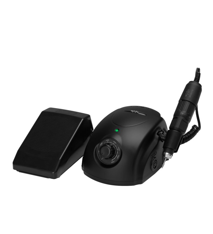W zestawie znajduje się napęd nożny, który umożliwia sterowanie prędkością obrotów za pomocą siły nacisku – wystarczy podłączyć i nacisnąć, bez konieczności przełączania trybów. Ułatwia pracę, pozwalając sterować urządzeniem bez użycia rąk, co zwiększa komfort podczas zabiegów. Podczas pracy głowicę można bezpiecznie odwiesić na uchwycie z tworzywa sztucznego, który można zamontować po obu stronach bazy i pod różnymi kątami, w zależności od preferencji użytkownika. Dedykowane miejsce na frezy w obudowie pozwala na ich wygodne uporządkowanie i trzymanie pod ręką w trakcie pracy.