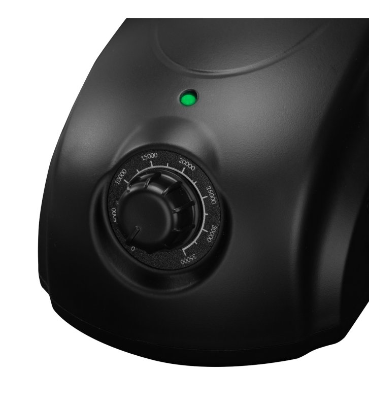 Frezarka wyposażona jest w pokrętło z podziałką, umożliwiające płynną regulację prędkości w zakresie od 5 000 do 35 000 obrotów na minutę. Zielona dioda sygnalizuje gotowość urządzenia do pracy. Zastosowany system CLICK zapobiega niedokręceniu pokrętła – charakterystyczne kliknięcie potwierdza prawidłowe ustawienie, chroniąc silnik przed przeciążeniem i wydłużając żywotność urządzenia. Przełączniki umieszczone na boku obudowy umożliwiają zmianę kierunku obrotów.