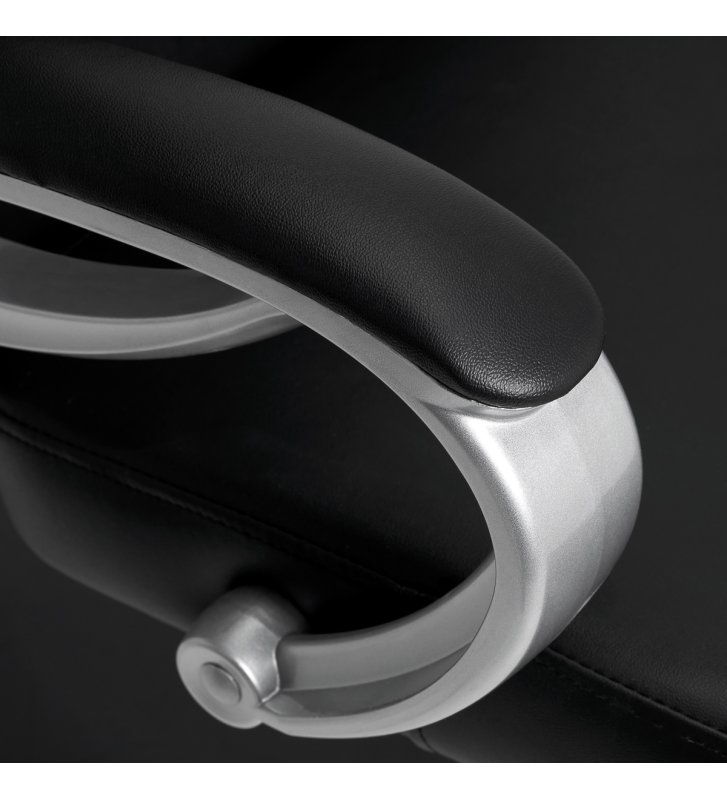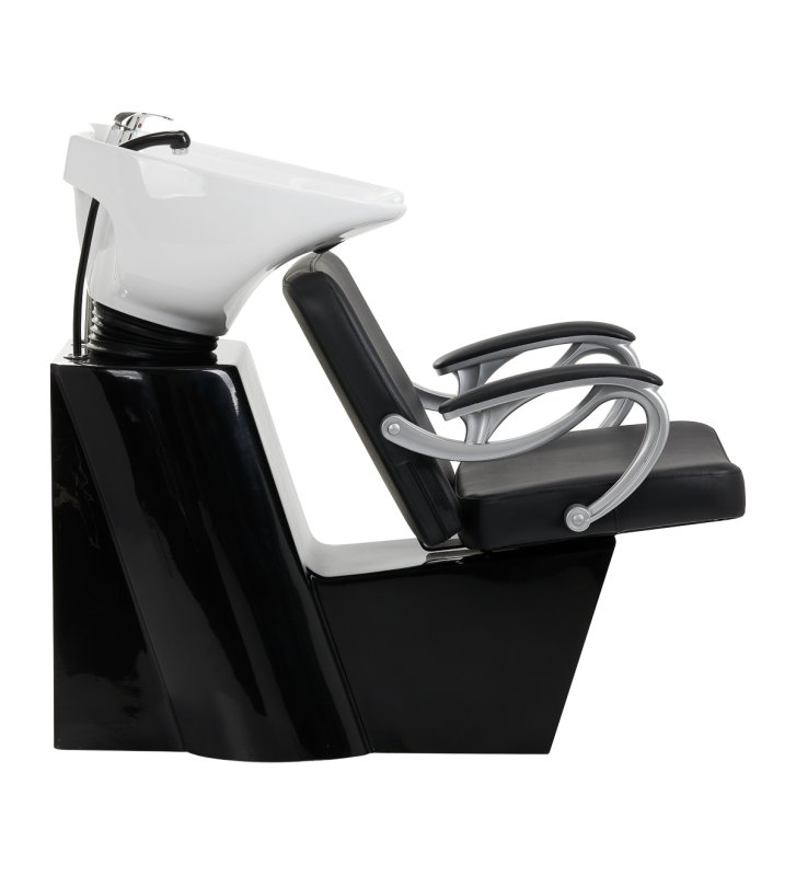Odpowiednio wyprofilowany fotel wypełniony trwałą pianką zapewnia wysoki komfort użytkowania, a ciekawie wygięte, częściowo tapicerowane podłokietniki pozwalają na prawidłowe ułożenie barków klienta i są atrakcyjnym wizualnie elementem. Wygodne oparcie pozwala na zajęcie odpowiedniej pozycji i zapewnia wsparcie pleców. Pokrycie w odcieniach czerni oraz ozdobne powierzchnie metalowe lakierowane w barwach złota nadają mu wyraz ponadczasowej elegancji, a dodatkowo gwarantują wieloletnią wytrzymałość oraz łatwość czyszczenia. Oryginalny wygląd myjni nadaje wnętrzom niepowtarzalnego wyrazu. W zestawie znajduje się kompletna armatura, w tym bateria, słuchawka prysznicowa oraz dedykowane węże, aby zapewnić całkowity zestaw narzędzi do pracy.