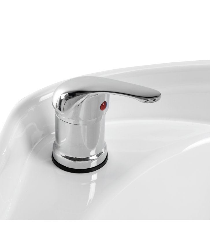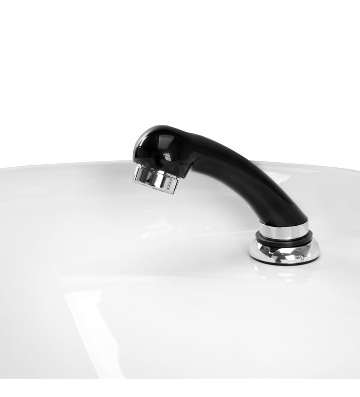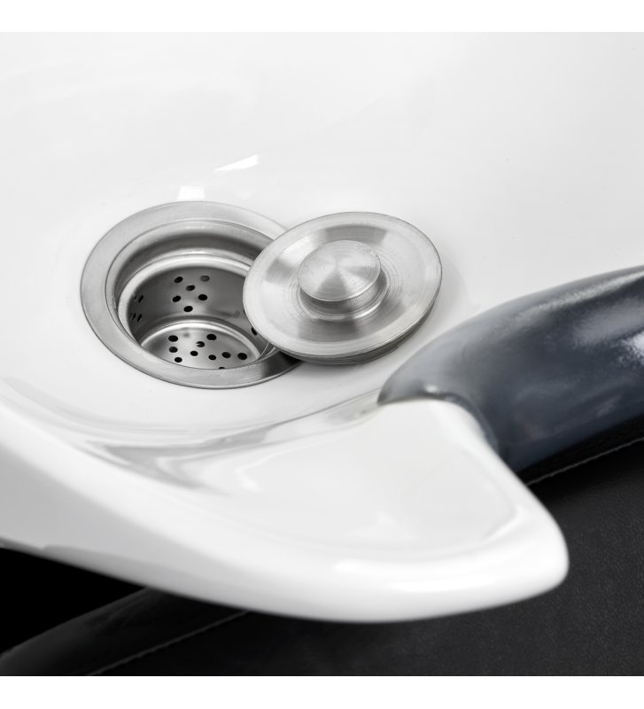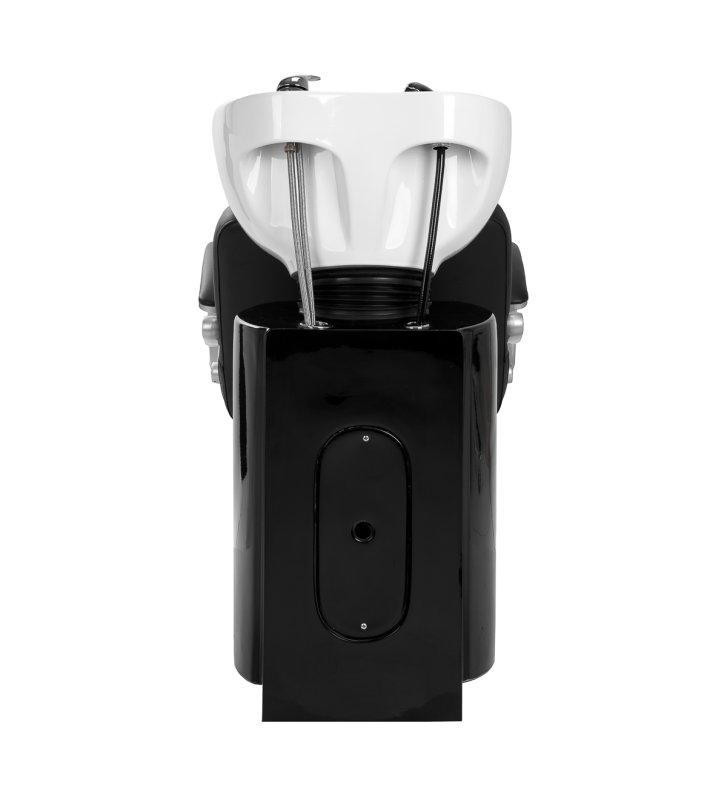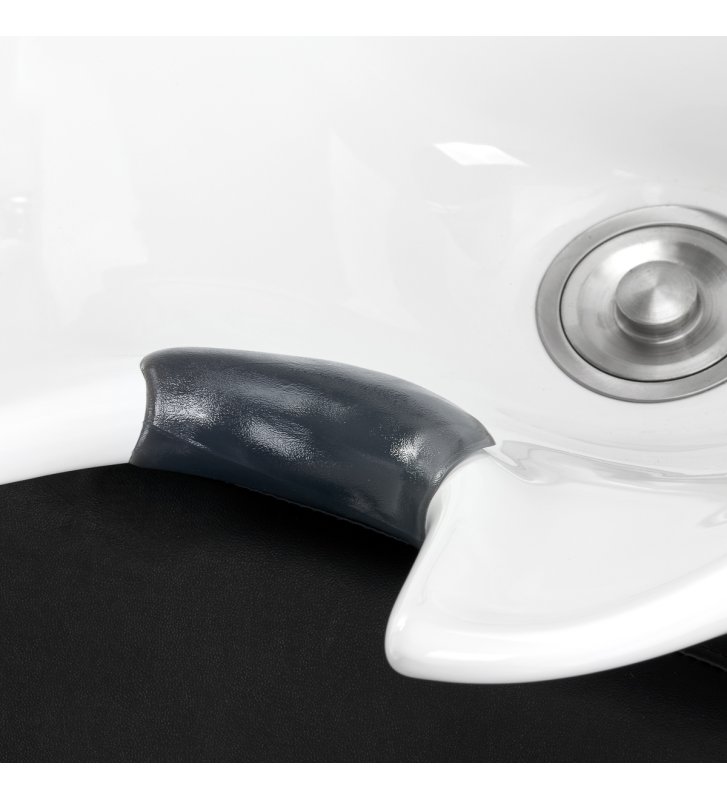 Odpowiednia głębokość białej, ceramicznej misy umywalki zapobiega nadmiernemu rozchlapywaniu wody oraz produktów używanych w trakcie zabiegu. Umożliwia tym samym komfortowe i efektywne wykonywanie szerokiej gamy usług. Ruchomość misy pozwala na łatwe dopasowanie kąta jej nachylenia do indywidualnych potrzeb. Zastosowany materiał sprawia, że umywalka jest wytrzymała, odporna na przebarwienia i zadrapania oraz bardzo łatwa do utrzymania w czystości. Odpowiednio wyprofilowany kołnierz zapewnia optymalne wsparcie oraz wygodę w trakcie mycia włosów, a komfortowa nakładka z tworzywa sztucznego w odcieniach czerni sprawia, że klient nie odczuje nieprzyjemności związanych z chłodem ceramicznej powierzchni.
