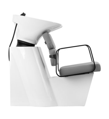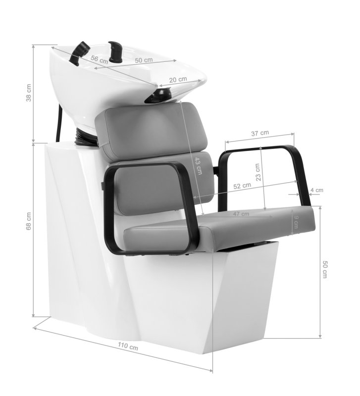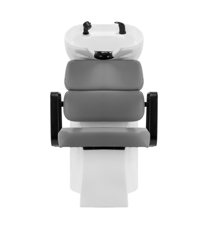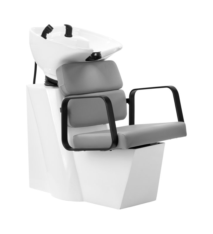 Wyprofilowany fotel zapewnia odpowiednie wsparcie lędźwi, a co za tym idzie wysoki komfort użytkowania. Metalowe podłokietniki w odcieniach czerni o geometrycznym kształcie pozwalają na prawidłowe ułożenie barków klienta. Wypełnienie z trwałej, odpornej na odkształcenia pianki oraz obicie wykonane z przyjemnej w dotyku skóry syntetycznej w odcieniach szarości zapewniają trwałość mebla, łatwość czyszczenia i komfortowe użytkowanie przez długi czas. Oryginalny, elegancki wygląd myjni nadaje wnętrzom niepowtarzalnego wyrazu. W zestawie znajduje się kompletna armatura w odcieniach czerni, w tym bateria, słuchawka prysznicowa oraz dedykowane węże, aby zapewnić kompletny zestaw narzędzi do pracy.