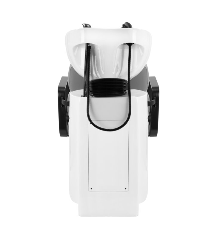 Praktyczna myjnia wyposażona została w baterię z mieszaczem, co zapewnia swobodny dostęp do ciepłej oraz zimnej wody. Ułatwia to dopasowanie temperatury do indywidualnych preferencji klienta. Dedykowane miejsce na odłożenie słuchawki usprawnia pracę, a chromowany korek ze specjalnym sitkiem pozwala na kontrolę przepływu wody oraz utrzymanie wysokich standardów higieny w salonie. Przyłącze wody zostało umieszczone wewnątrz podstawy, umożliwiając sprawne ukrywanie rur. Znacznym plusem tego modelu jest otwór pozostawiony pomiędzy oparciem a siedziskiem, który ułatwia zachowanie czystości w salonie, pozwalając w łatwy sposób wymieść zabrudzenia z każdego zakamarka fotela. Myjnia wyprofilowana została w taki sposób, by zapewniać wygodę podczas wykonywania różnorodnych zabiegów, gwarantując odpowiednie wsparcie pleców. Połączenie funkcjonalności i udogodnień sprawia, że praca w salonie fryzjerskim jest jeszcze bardziej komfortowa.