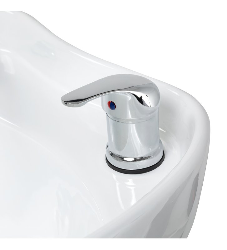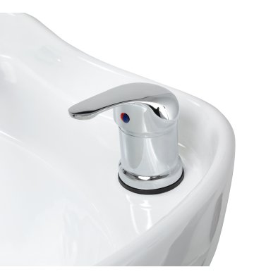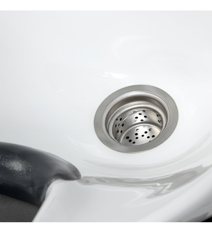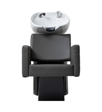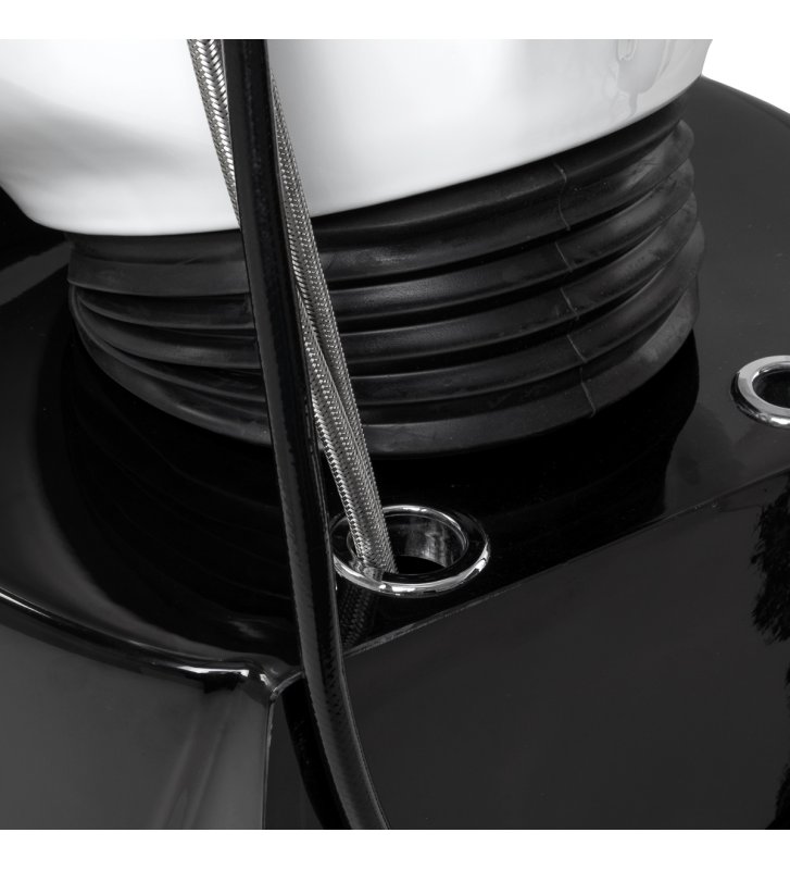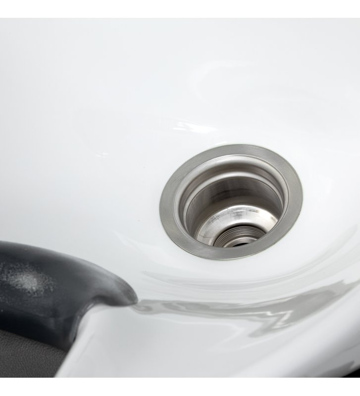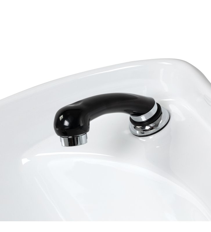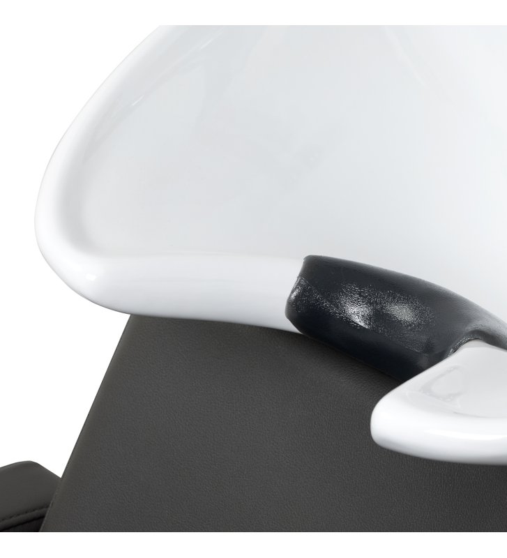 Głęboka ceramiczna misa w odcieniach bieli skutecznie ogranicza rozchlapywanie wody oraz preparatów używanych podczas zabiegów. Sprzyja to komfortowemu i precyzyjnemu wykonywaniu różnorodnych usług fryzjerskich. Ruchoma konstrukcja misy pozwala na łatwe dopasowanie kąta nachylenia do indywidualnych potrzeb. Zastosowany materiał jest trwały, odporny na przebarwienia i zarysowania, a także łatwy w utrzymaniu czystości. Odpowiednio wyprofilowany kołnierz zapewnia wygodne podparcie głowy podczas mycia, natomiast komfortowa nakładka z tworzywa sztucznego w odcieniach czerni eliminuje uczucie chłodu ceramicznej powierzchni.