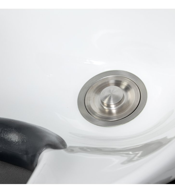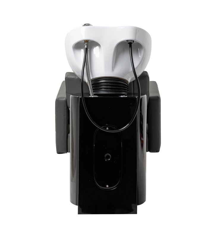 Myjnia została wyposażona w baterię z mieszaczem, która umożliwia wygodne korzystanie z ciepłej i zimnej wody oraz łatwe dopasowanie temperatury do potrzeb klienta. Praktyczne miejsce na odłożenie słuchawki natryskowej ułatwia organizację pracy i pozwala utrzymać porządek na stanowisku. Korek z sitkiem pozwala kontrolować przepływ wody, jednocześnie dbając o zachowanie wysokich standardów higieny. W zestawie znajduje się kompletna armatura – bateria, słuchawka prysznicowa oraz dedykowane węże, które tworzą gotowy zestaw do pracy. Przyłącze wody zostało umieszczone wewnątrz podstawy myjni, co pozwala na estetyczne ukrycie instalacji. W podstawie myjni znajdują się miejsca do przykręcenia jej do podłoża – to rozwiązanie zwiększa stabilność całej konstrukcji. Połączenie funkcjonalnych rozwiązań i przemyślanych detali przekłada się na komfort codziennej pracy w salonie fryzjerskim.
