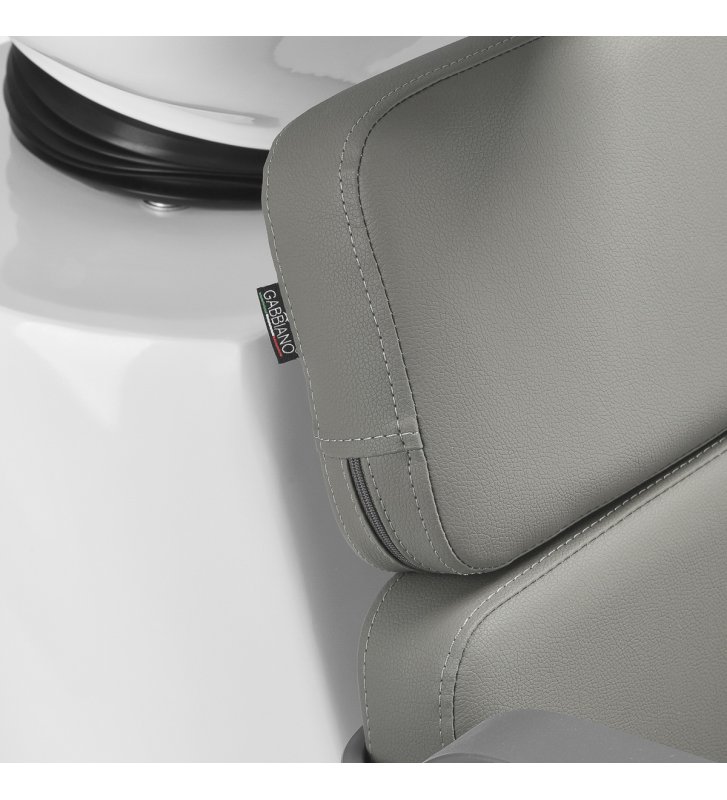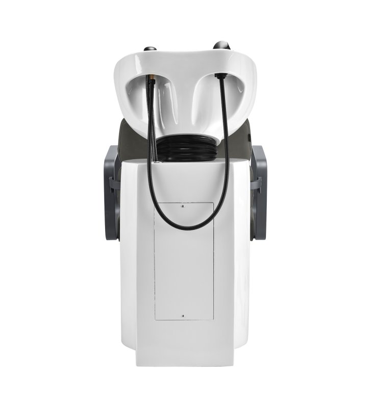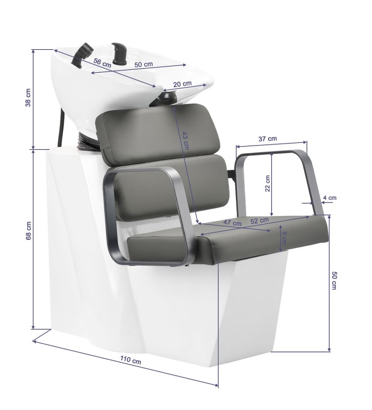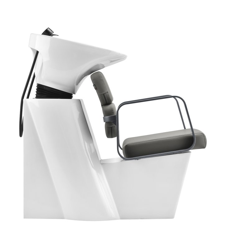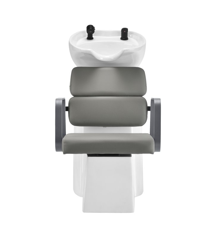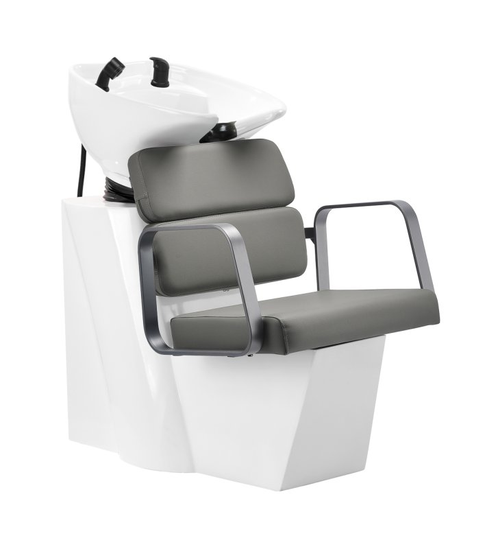Wyprofilowany fotel zapewnia odpowiednie wsparcie lędźwi, a co za tym idzie wysoki komfort użytkowania. Metalowe podłokietniki w odcieniach szarości o geometrycznym kształcie pozwalają na prawidłowe ułożenie barków klienta. Wypełnienie z trwałej, odpornej na odkształcenia pianki oraz obicie wykonane z przyjemnej w dotyku skóry syntetycznej w odcieniach szarości zapewniają trwałość mebla, łatwość czyszczenia i komfortowe użytkowanie przez długi czas. Oryginalny, elegancki wygląd myjni nadaje wnętrzom niepowtarzalnego wyrazu. W zestawie znajduje się kompletna armatura w odcieniach czerni, w tym bateria, słuchawka prysznicowa oraz dedykowane węże, aby zapewnić kompletny zestaw narzędzi do pracy.