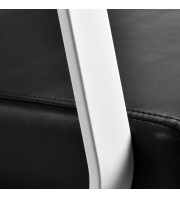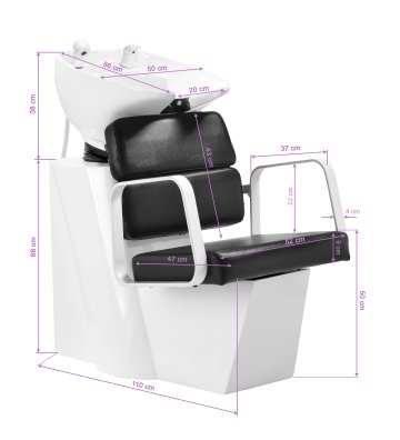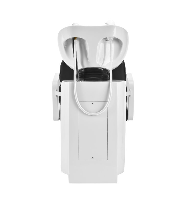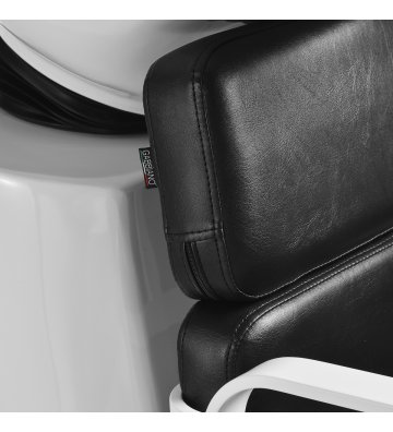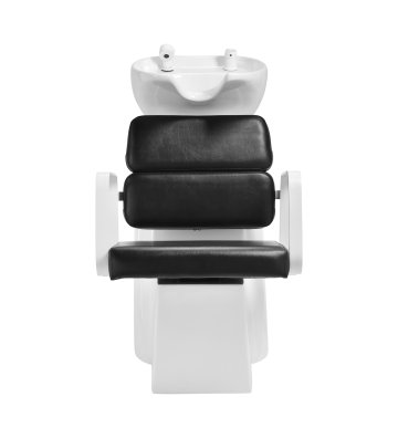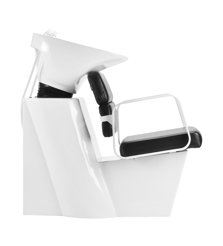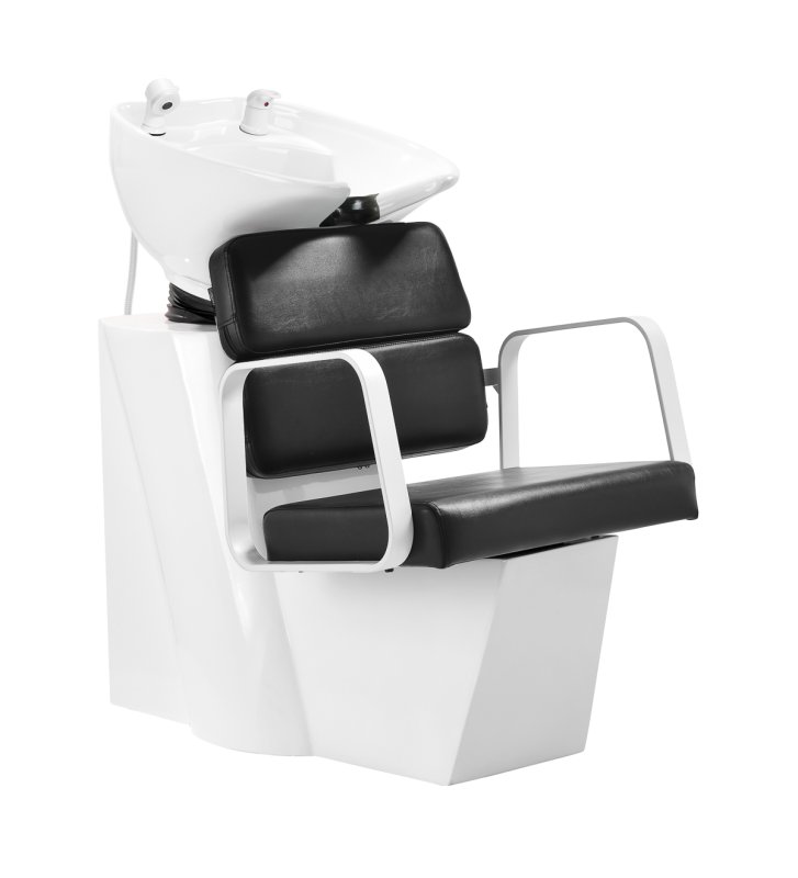 Wyprofilowany fotel zapewnia odpowiednie wsparcie lędźwi, a co za tym idzie wysoki komfort użytkowania. Metalowe podłokietniki w odcieniach bieli o geometrycznym kształcie pozwalają na prawidłowe ułożenie barków klienta. Wypełnienie z trwałej, odpornej na odkształcenia pianki oraz obicie wykonane z przyjemnej w dotyku skóry syntetycznej w odcieniach czerni zapewniają trwałość mebla, łatwość czyszczenia i komfortowe użytkowanie przez długi czas. Oryginalny, elegancki wygląd myjni nadaje wnętrzom niepowtarzalnego wyrazu. W zestawie znajduje się kompletna armatura w odcieniach bieli, w tym bateria, słuchawka prysznicowa oraz dedykowane węże, aby zapewnić kompletny zestaw narzędzi do pracy.