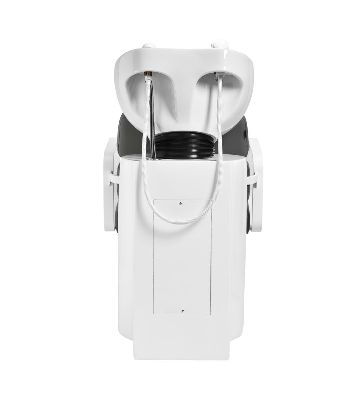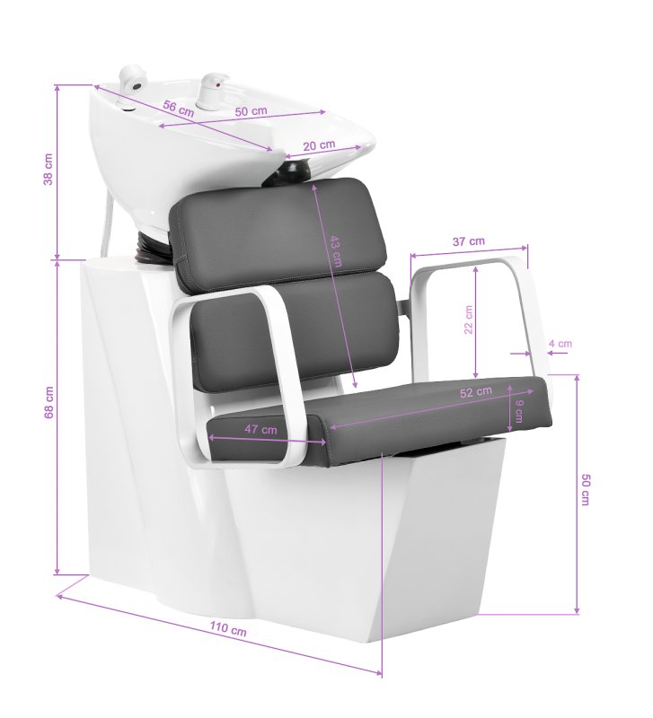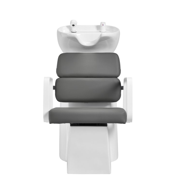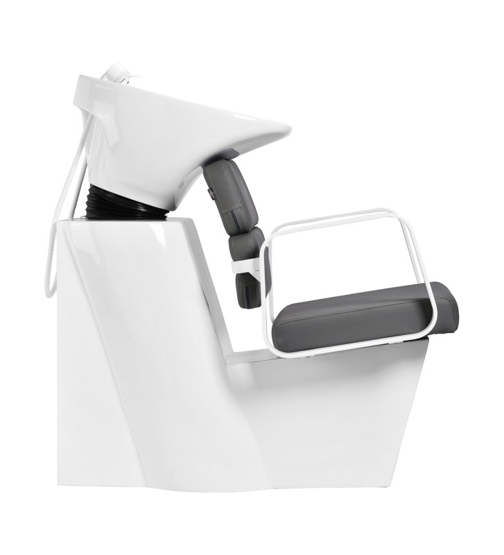 Wyprofilowany fotel zapewnia odpowiednie wsparcie lędźwi, a co za tym idzie wysoki komfort użytkowania. Metalowe podłokietniki w odcieniach bieli o geometrycznym kształcie pozwalają na prawidłowe ułożenie barków klienta. Wypełnienie z trwałej, odpornej na odkształcenia pianki oraz obicie wykonane z przyjemnej w dotyku skóry syntetycznej w odcieniach szarości zapewniają trwałość mebla, łatwość czyszczenia i komfortowe użytkowanie przez długi czas. Oryginalny, elegancki wygląd myjni nadaje wnętrzom niepowtarzalnego wyrazu. W zestawie znajduje się kompletna armatura w odcieniach bieli, w tym bateria, słuchawka prysznicowa oraz dedykowane węże, aby zapewnić kompletny zestaw narzędzi do pracy.