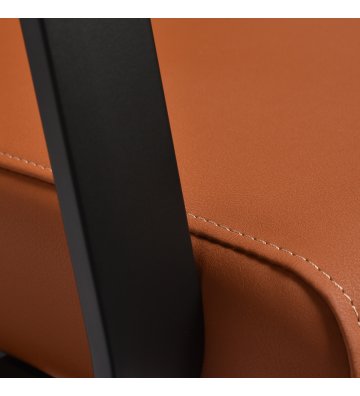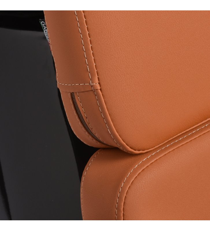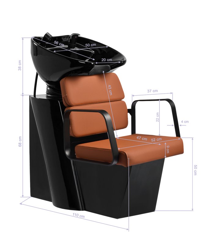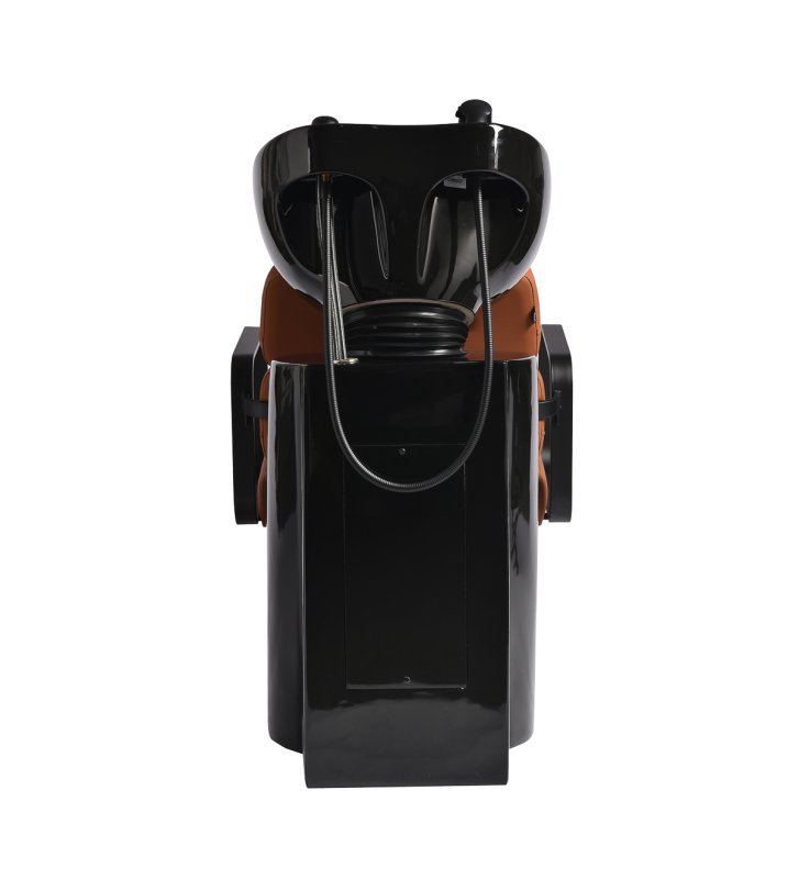 Wyprofilowany fotel zapewnia odpowiednie wsparcie lędźwi, a co za tym idzie wysoki komfort użytkowania. Metalowe podłokietniki w odcieniach czerni o geometrycznym kształcie pozwalają na prawidłowe ułożenie barków klienta. Wypełnienie z trwałej, odpornej na odkształcenia pianki oraz obicie wykonane z przyjemnej w dotyku skóry syntetycznej w odcieniach pomarańczu zapewniają trwałość mebla, łatwość czyszczenia i komfortowe użytkowanie przez długi czas. Oryginalny, elegancki wygląd myjni nadaje wnętrzom niepowtarzalnego wyrazu. W zestawie znajduje się kompletna armatura w odcieniach czerni, w tym bateria, słuchawka prysznicowa oraz dedykowane węże, aby zapewnić kompletny zestaw narzędzi do pracy.