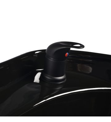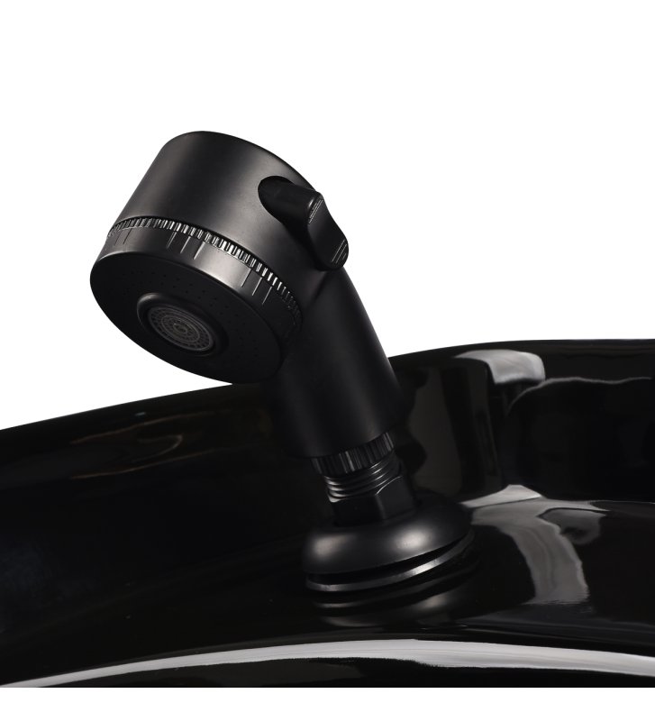 Odpowiednia głębokość czarnej ceramicznej misy umywalki zapobiega nadmiernemu rozchlapywaniu wody czy produktów stosowanych w trakcie zabiegów. Pozwala to na komfortowe i efektywne wykonywanie szerokiej gamy usług. Kąt nachylenia misy można dostosowywać, dzięki czemu łatwo o dopasowanie do indywidualnych potrzeb. Wysoka jakość zastosowanych materiałów sprawia, że umywalka jest wytrzymała, odporna na przebarwienia i zadrapania oraz bardzo łatwa do czyszczenia. Odpowiednio wyprofilowany kołnierz oraz nachylone oparcie zapewniają wsparcie i wygodę w trakcie mycia włosów, a dzięki komfortowej nakładce z tworzywa sztucznego w odcieniach czerni klient nie odczuje nieprzyjemności związanych z chłodem ceramicznej powierzchni.