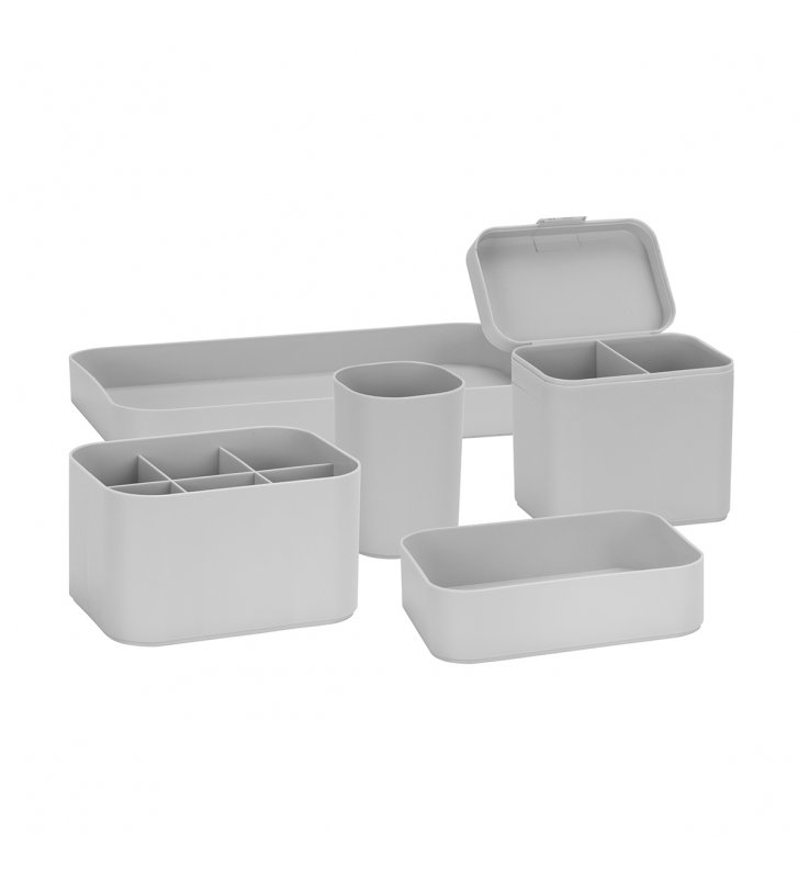 The five-piece set of storage containers will allow you to organize all the accessories and tools needed in professional beauty or hairdressing salons, but it will also be perfect at home. Plastic containers are easy to keep clean . The neutral gray color and simple design will perfectly match the style of any interior. The elements of the set will also work as inserts for drawers and wardrobes.
