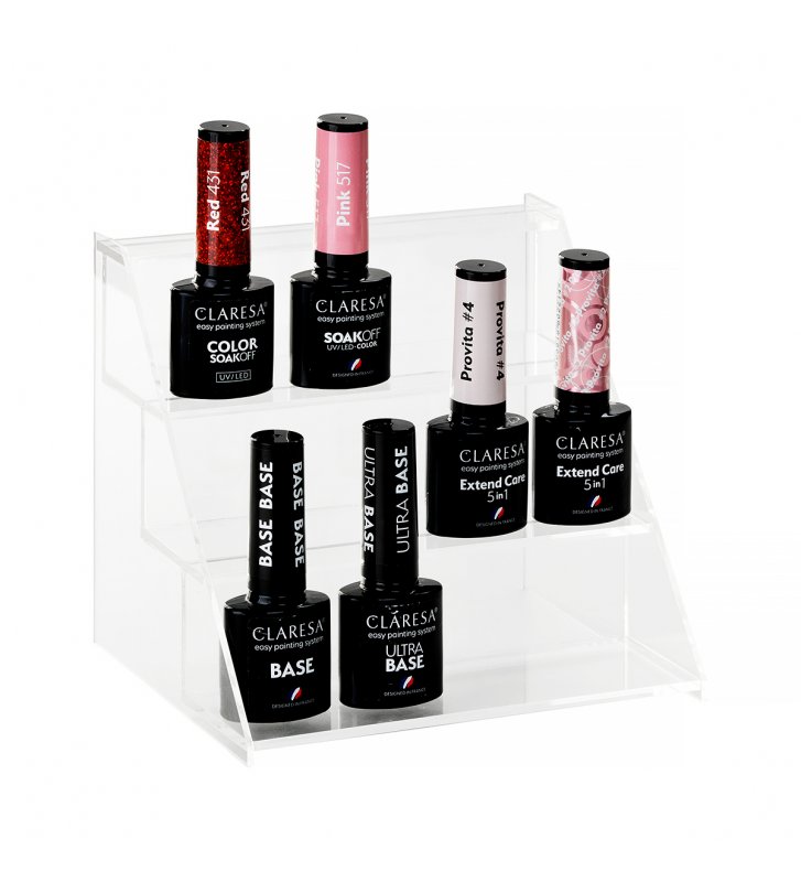 The stand has 3 shelves with a protected edge, thanks to which it can easily accommodate 12 hybrid polishes. It can also be arranged in such a way that it is distinguished by 3 deeper shelves and one shallower, thanks to which it can fit up to 16 polishes! The material it is made of is easy to clean , just use mild soap and water. The functional organizer is immediately ready for use - no need to twist it.
