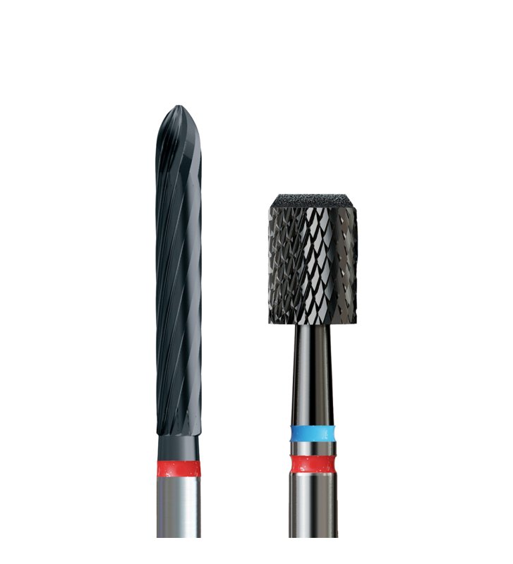 A diamond cutter in the shape of a point/needle, made of stainless steel with diamond grit. Covered with a protective nanocoating - black, marked with a blue stripe. Its size is 1.8 mm.
