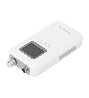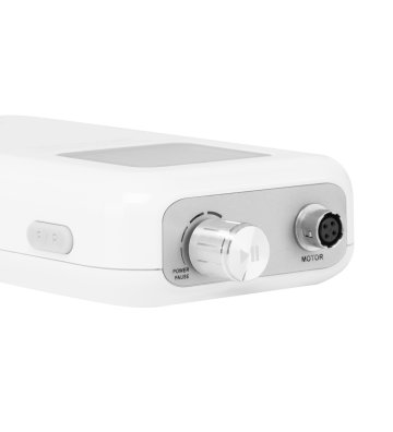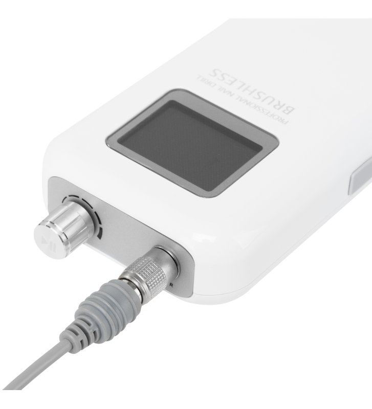 Za pomocą pokrętła można płynnie regulować prędkość pracy głowicy, osiągając aż 35 000 obrotów na minutę, co umożliwia łatwe dostosowanie do indywidualnych potrzeb i zapewnia komfort podczas wykonywania różnych zabiegów. Naciśnięcie pokrętła pozwala na natychmiastowe zatrzymanie i wznowienie pracy urządzenia (funkcja pauzy), co daje pełną kontrolę nad przebiegiem pracy. Praktyczne przyciski umieszczone po bokach umożliwiają szybkie przełączenie na napęd nożny oraz zmianę kierunku obrotów, co dodatkowo ułatwia dostosowanie urządzenia do różnych usług. Na wyświetlaczu wyświetlane są informacje o kierunku obrotów, stanie baterii, włączeniu napędu nożnego i aktywnej pauzie. Dodatkowo, urządzenie zostało wyposażone w zabezpieczenie przed przeciążeniem, które chroni silnik przed przegrzaniem, zapewniając większe bezpieczeństwo pracy i trwałość sprzętu.