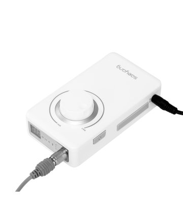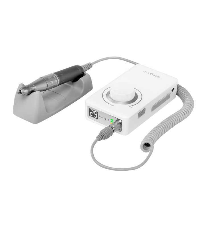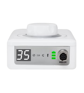 Przy użyciu pokrętła można regulować prędkość pracy głowicy do 35 000 obrotów na minutę, co pozwala na sprawne dostosowanie do indywidualnych potrzeb, a co za tym idzie komfortowe wykonywanie szerokiej gamy zabiegów. Przydatne przyciski umieszczone po bokach pozwalają łatwo przełączyć sterowanie na napęd nożny, zatrzymać pracę urządzenia (funkcja pauzy), a także zmienić kierunek obrotów, co zapewnia pełną kontrolę nad frezarką i ułatwia dostosowanie jej działania do konkretnych usług. Kontrolki LED pozwalają obserwować stan sprzętu – informują o kierunku obrotów, stanie baterii, włączeniu napędu nożnego i pauzy. Urządzenie wyposażone jest w zabezpieczenie przed przeciążeniem z ostrzegawczym sygnałem LED, co chroni silnik przed przegrzaniem, tym samym zapewniając większe bezpieczeństwo pracy oraz chroniąc sprzęt przed uszkodzeniem.