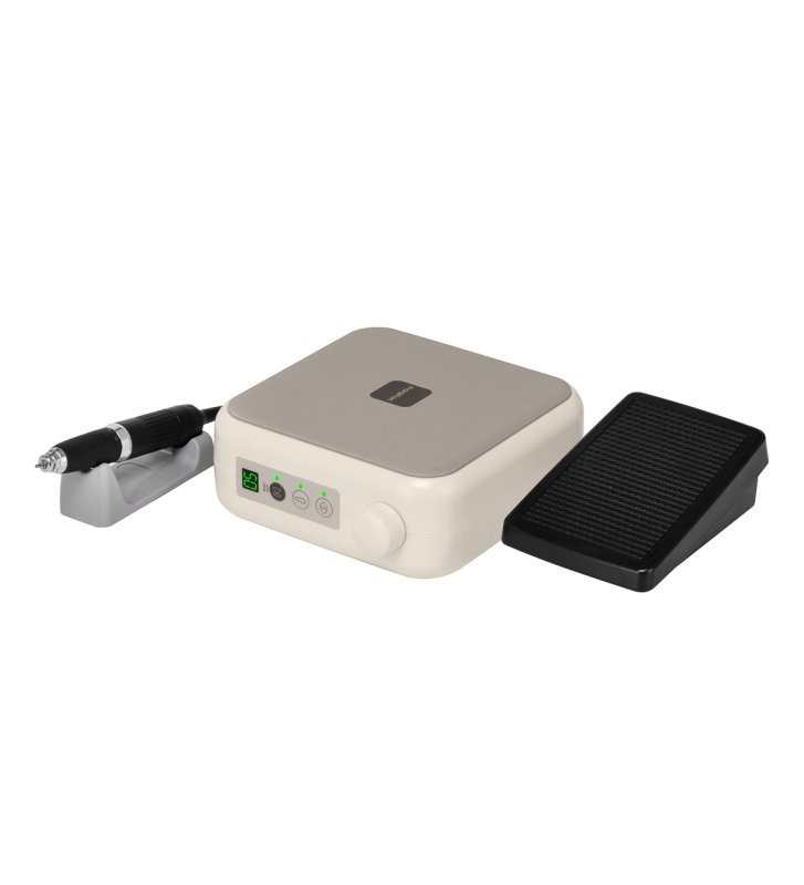 Using the knob, you can adjust the speed of the head up to 50,000 revolutions per minute , and the current speed is displayed on a digital screen . It allows for efficient adjustment to individual needs, and therefore comfortable performance of a wide range of treatments . The speed is displayed on a digital display . The buttons allow for quick switching to the foot drive, changing the direction of rotation and stopping the device (pause function), which provides full control over the milling machine and makes it easier to adapt its operation to the services performed. LED indicators inform about the status of the device , indicating the direction of rotation, activation of the foot drive, activation of the cruise control function and pause. Operation of the equipment is simple, effective and intuitive , which will certainly be appreciated by more demanding users.